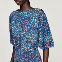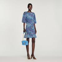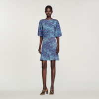 Short dress with a round neck, short elasticated sleeves, a smocked waist, ruffled skirt, and floral print. Sandro Women's short dress Floral print Short gathered sleeves Smocked waist Ruffle at the hem The model is 5'10" tall and wears a size 1 FR / 4 US. Reference : SFPRO02883 MATERIALS Main fabric: 96% viscose, 4% elastane