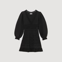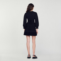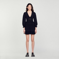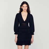Short pointelle knit dress featuring a V-shaped neckline, long sleeves, voluminous shoulders, ruffled cuffs, and a ruffle skirt with scalloped details. Sandro Women's short pointelle knit dress V-shaped neckline with openwork edges Long sleeves with ruffled cuffs Openwork panel at the waist Ruffled skirt with scalloped details The model is 5'10" tall and wears a size 36 FR / 4 US. This item's main material is at least 50% recycled. Recycling reduces the environmental impact by limiting the use of virgin materials. Sandro is committed to ever more responsible fashion. As part of our traceability project in partnership with Fairly Made, we openly reveal information on the origin and manufacture of our clothing. All the stages for making and transforming this dress have been carried out in China, using at least 50% recycled viscose made in China. Reference : SFPRO02739 MATERIALS Lower main fabric: 62% viscose, 37% polyamide, 1% elastane Upper main fabric: 54% viscose, 44% polyamide, 2% elastane Sleeves: 54% viscose, 44% polyamide, 2% elastane