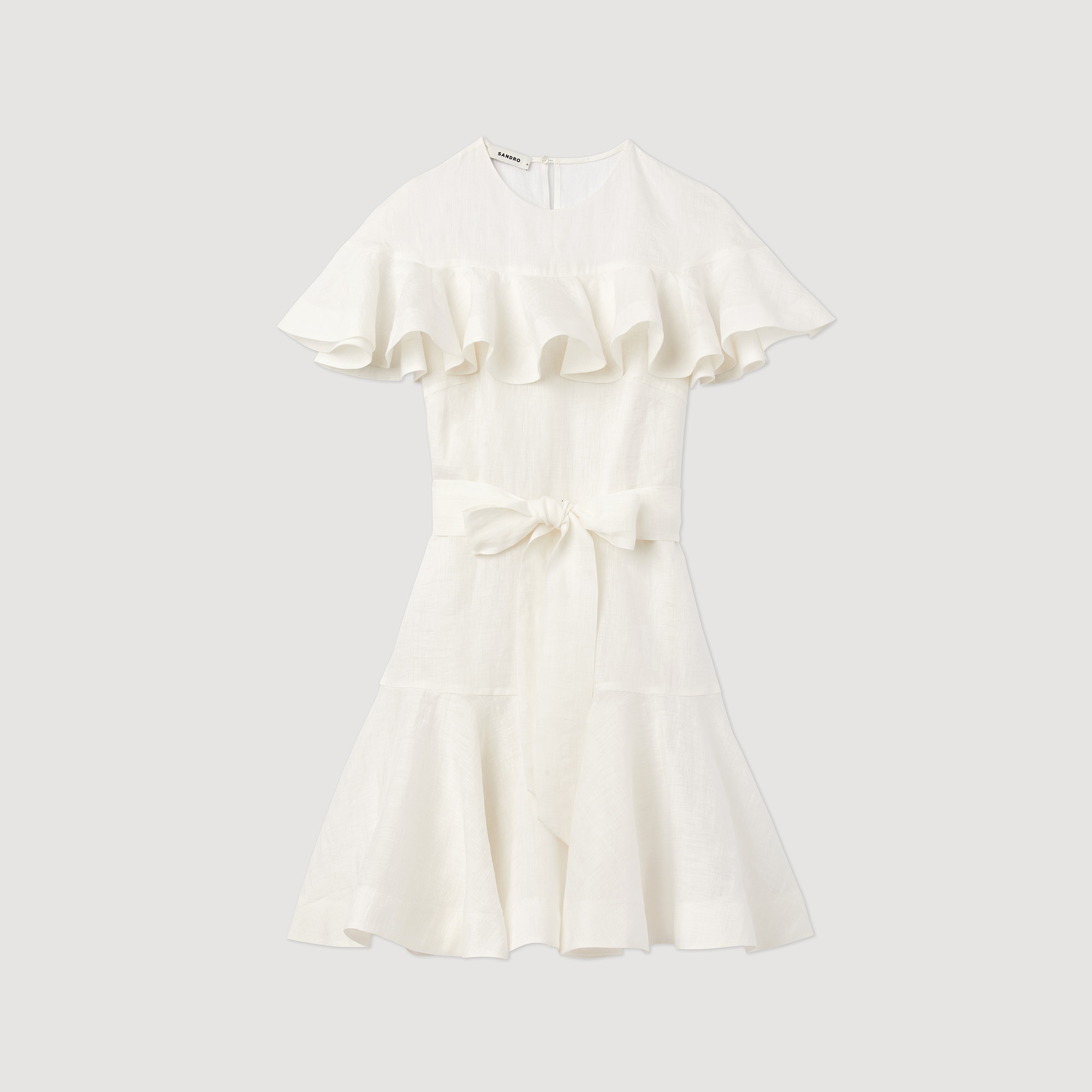 Short dress with a full skirt, a boat neck, short ruffle sleeves and a belt to tie around the waist. Sandro Women's short dress Boat neck Ruffled short sleeves Full skirt Tone-on-tone belt to tie around the waist Reference : SFPRO02791 MATERIALS Main fabric: 86% linen, 14% polyester Buttons: 100% nacre Lining: 100% cotton