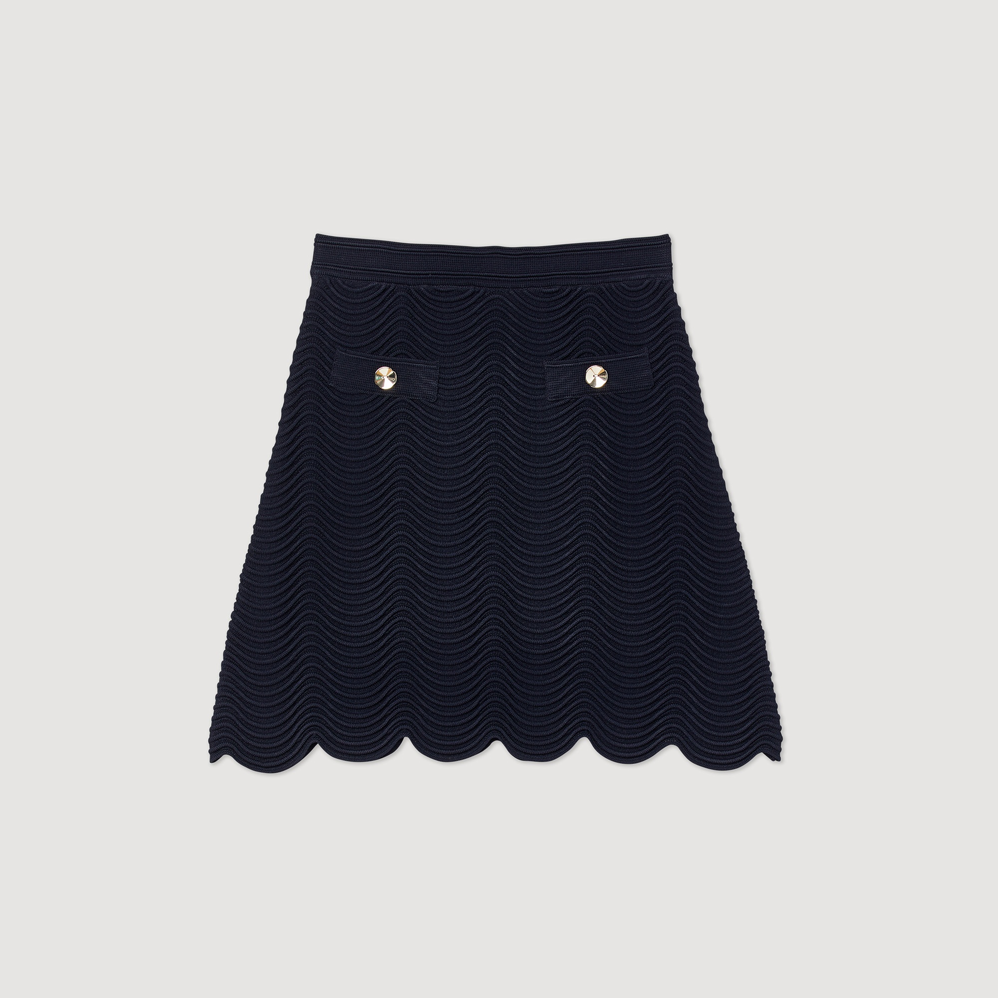 Short, fancy-stitch knitted skirt with button pockets. Sandro Women's short knit skirt Fancy stitch 2 pockets with buttons This item's main material is at least 50% recycled. Recycling reduces the environmental impact by limiting the use of virgin materials. Reference : SFPJU00796 MATERIALS Main fabric: 58% viscose, 41% polyamide, 1% elastane