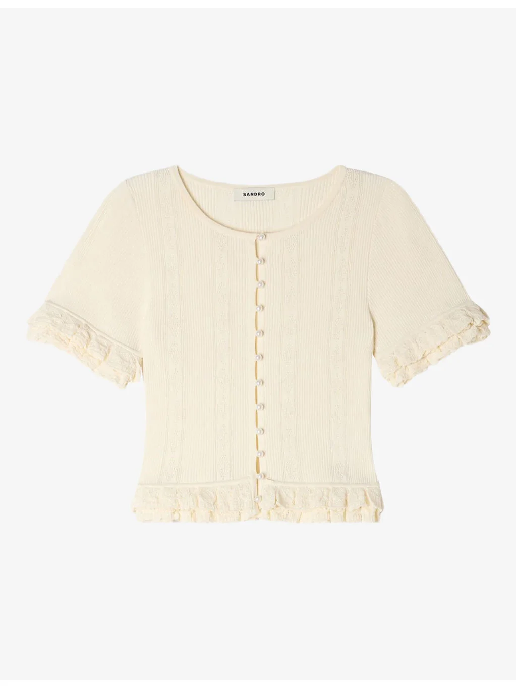 PRODUCT DETAILS - Sandro knitted cardigan - 63% viscose, 22% polyamide, 12% polyester, 3% elastane - Button fastening - Regular fit, round-neck, short sleeves, ruffle trim, faux-pearl buttons, cropped - Hand wash - True to size - Model is 5ft 9in/1.75m and wears a size UK 8 - Lightweight, slight stretch Ref: R04598492