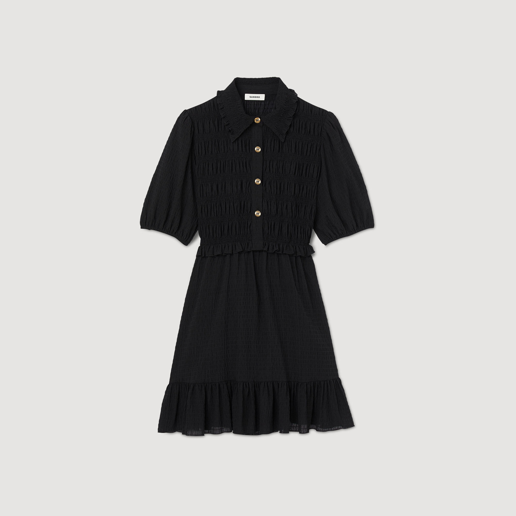 Short dress with button-down shirt collar and short sleeves, embellished with smocking at the top and a floaty, billowy skirt with ruffles at the bottom. Sandro Women's short smocked dress Button-down shirt collar Short sleeves Double S buttons Flared floaty, billowy skirt The model is 178 cm / 5'10" tall and wears a size 36 FR / 8 UK The model is 177 cm / 5'9 tall and wears a size 36 FR / 8 UK COMPOSITION Main fabric: 100% polyester Lining: 100% polyester Reference: SFPRO03251_20