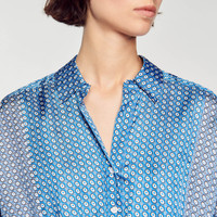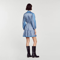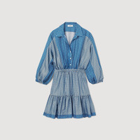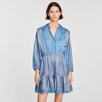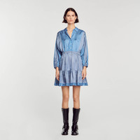 Short satin dress with long sleeves, an open buttoned shirt collar, a flared skirt, an elasticated waist, and an all-over tie print. Sandro Women's short tie-print dress Buttoned shirt collar Long sleeves with gathered cuffs Elasticated waist Flared ruffle dress The viscose in this item is made of cellulose from sustainably managed forests. The model is 5'9" tall and wears a size 36 FR / 4 US Reference : SFPRO03139 MATERIALS Main fabric: 100% viscose Buttons: 100% nacre