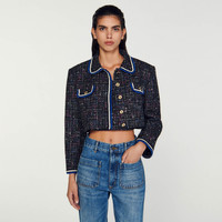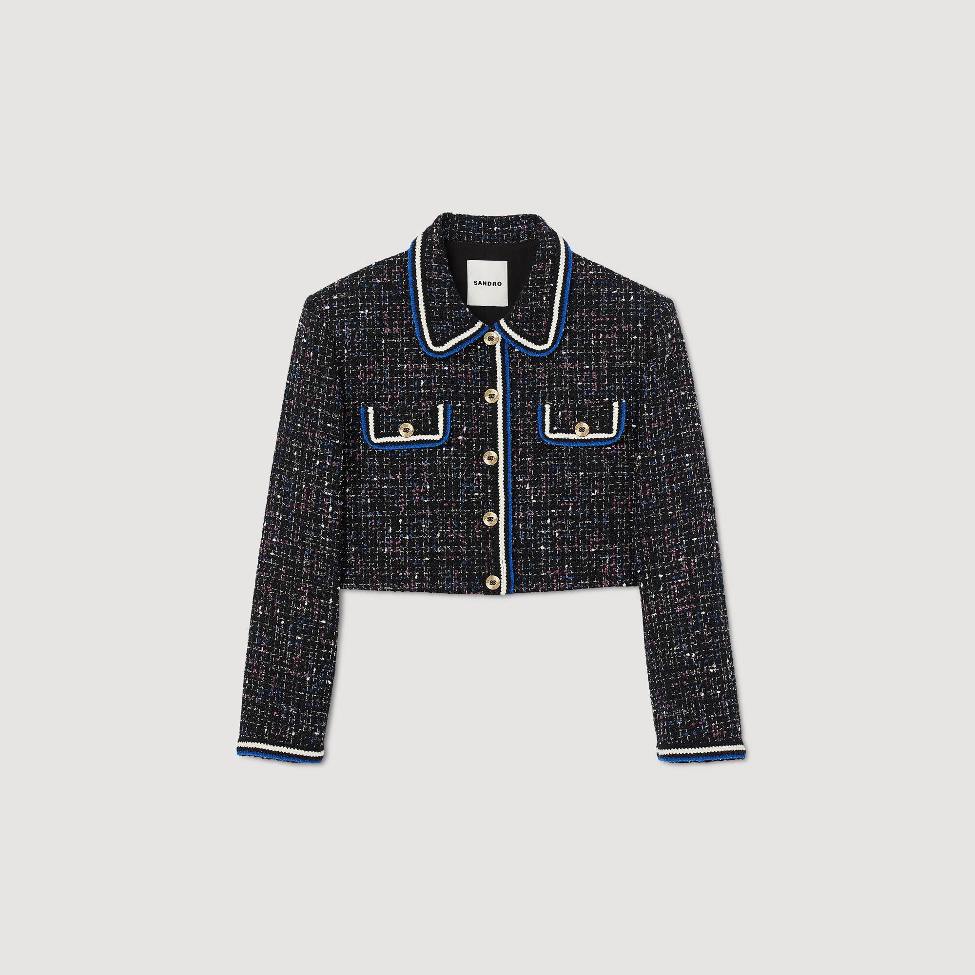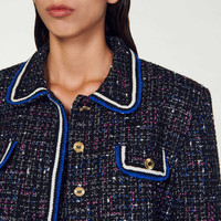 Short jacket in decorative tweed, featuring a curved collar, long sleeves, a button fastening, flap pockets on the chest and embellished with contrasting trim. Short tweed jacket Curved collar Long sleeves 2 flap pockets Contrasting trim The model is 177 cm / 5'9" tall and wears a size 36 FR / 8 UK The model is 177 cm / 5'9 tall and wears a size 36 FR / 8 UK COMPOSITION Main fabric: 68% cotton, 22% viscose, 6% acrylic, 3% polyamide, 1% metalized fibers Lining: 100% viscose Braid: 86% cotton, 14% polyester Pocket lining: 100% cotton Reference: SFPVE00838_B239