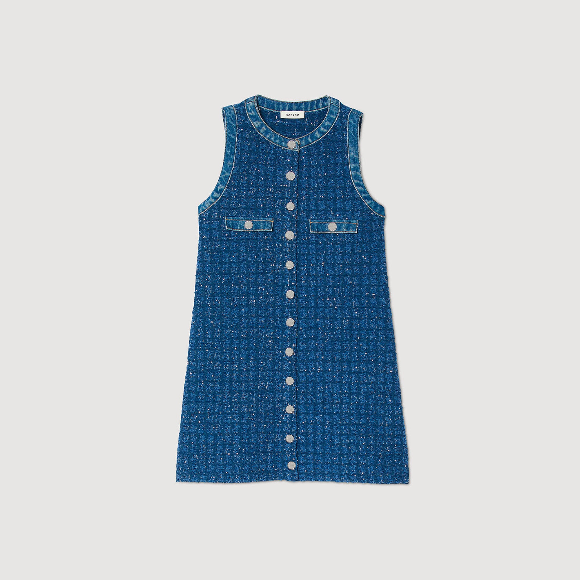 Sleeveless short trapeze dress in glittering tweed-effect decorative knit featuring a round neck, button fastening and welt pockets on the chest. Sandro Women's decorative knit short dress Trapeze cut Round neck Sleeveless Button fastening 2 chest pockets Denim finish The model is 178 cm / 5'10 tall and wears a size 36 FR / 8 UK The model is 178 cm / 5'10 tall and wears a size 36 FR / 8 UK COMPOSITION Main fabric: 40% polyamide, 35% viscose, 12% polyester, 9% cotton, 2% wool, 2% elastane Secondary fabric: 100% cotton Band: 52% viscose, 45% polyamide, 3% elastane Reference: SFPRO03474_47
