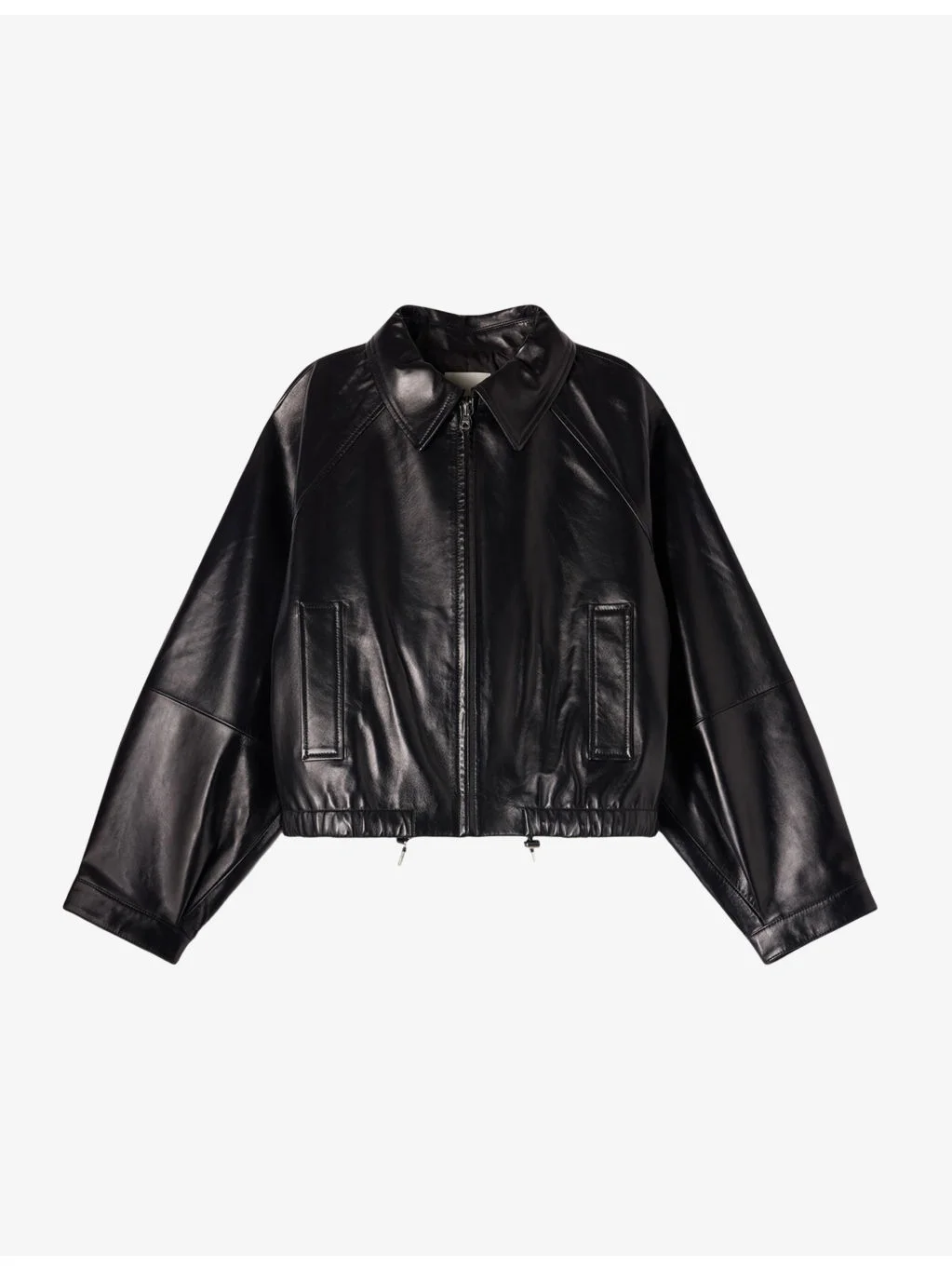 PRODUCT DETAILS - Sandro leather jacket - 100% leather - Zip fastening - Regular fit, collar, long sleeves, side pockets, buttoned cuffs, elasticated hem, cropped - Specialist leather clean - True to size - Model is 5ft 11in/1.80m and wears a size UK 8 - Heavyweight, non-stretch Ref: R04598438
