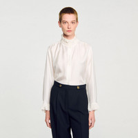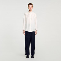 Sandro women's shirt • Silk floaty shirt • Smocked-effect gathered collar • Long sleeves with gathered cuffs • Rounded asymmetric hem The model is 5'10" tall and wears a size 1 FR / 4 US COMPOSITION Main fabric: 100% silk Secondary fabric: 67% linen, 33% silk Buttons: 100% nacre Reference: SFPCM00517_11