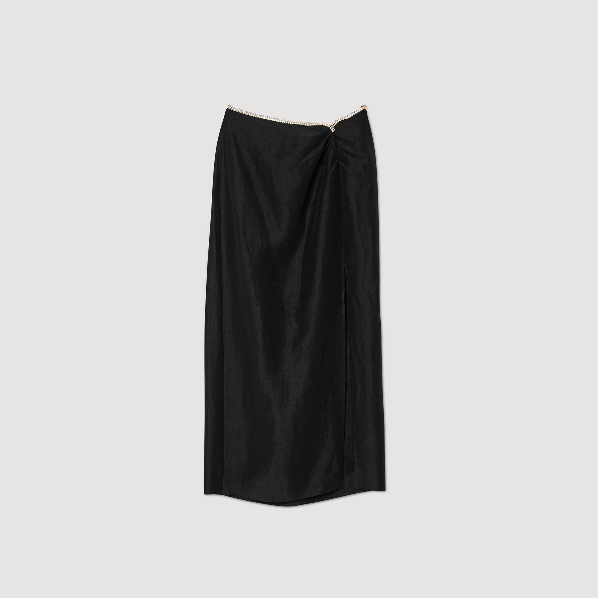 Midi pencil skirt with a front slit and a gathered asymmetrical waist embellished with a multicolored crystal trim. Sandro Women's midi skirt with slit Multicolored rhinestones Front slit Gathered asymmetrical waist Zipper This skirt has a matching top The model is 5'11" tall and wears a size 36 FR / 4 US The viscose in this item is made of cellulose from sustainably managed forests. Reference : SFPJU00845 MATERIALS Main fabric: 52% viscose, 48% linen