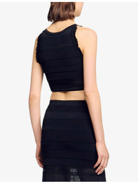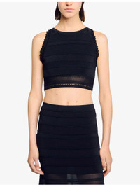 PRODUCT DETAILS - Sandro knitted top - 83% viscose, 15% polyamide, 2% elastane - Slips on - Regular fit, round neck, sleeveless, ruffled trim, cropped - Hand wash - True to size - Model is 5ft 10in/1.78m and wears a size UK 8 - Midweight, slight stretch Ref: R04412228