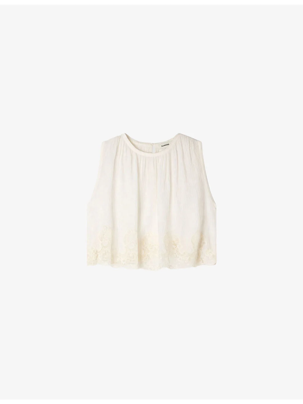 PRODUCT DETAILS - Sandro woven top - 73% viscose, 19% polyamide, 8% linen - Button fastening - Regular fit, round-neck, sleeveless, broderie anglaise hem, cropped - Dry clean - True to size - Model is 5ft 9in/1.75m and wears a size UK 8 - Lightweight, non-stretch Ref: R04598491