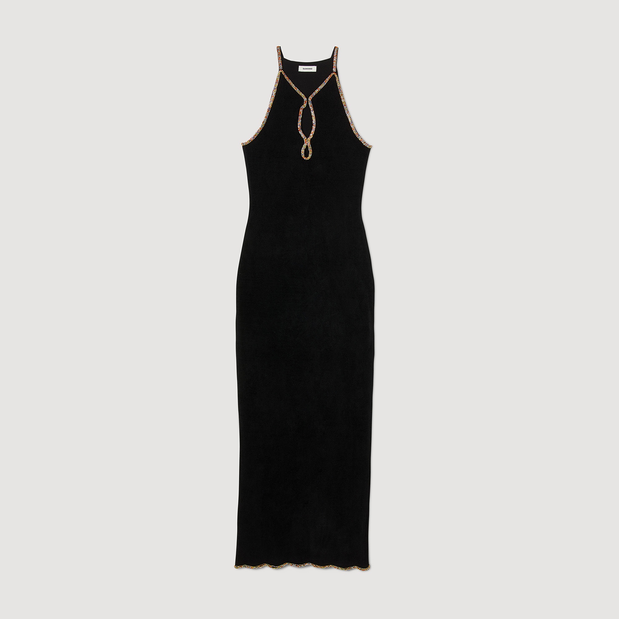 Maxi dress in velvet knit with American-style armholes, featuring a neck with a cutaway teardrop embellished with multicoloured rhinestones and slit at the back. Sandro Women's velvet knit maxi dress American armholes Rhinestone embellished neck with cutaway teardrop Slit on bottom rear Bottom embellished with rhinestones The model is 177 cm tall (5'8") and is wearing a size 36. Reference : SFPRO03389 MATERIALS Main fabric: 52% viscose, 47% polyamide, 1% elastane Diamante: 85% copper, 15% crystal