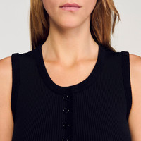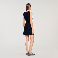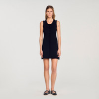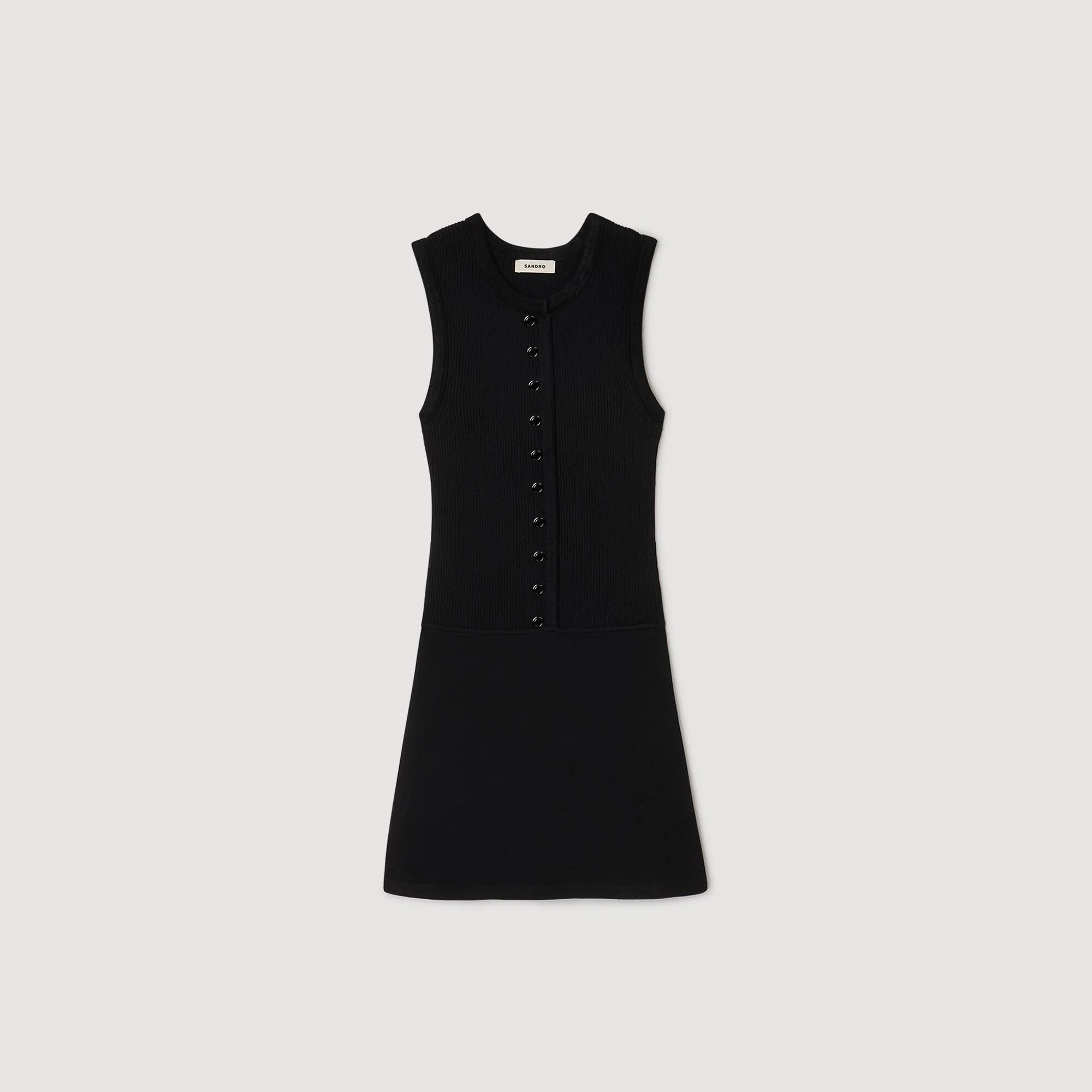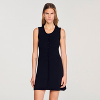 Mini rib-knit dress with a round neck and tone-on-tone press-stud fastening. - Sandro Women's mini knit dress - Round neck - Sleeveless - Press-stud fastening - Straight cut - True to size Reference: SFPRO04455_20 COMPOSITION & CARE Composition - Top: 57% viscose, 42% polyamide, 1% elastane - Skirt: 53% viscose, 45% polyamide, 2% elastane - Band: 56% polyamide, 42% viscose, 2% elastane Care advice - Hand wash - Do not bleach - Do not tumble dry - Iron at a maximum temperature of 110°C without steam - F - Professional dry clean, with hydrocarbon solvent, normal treatment