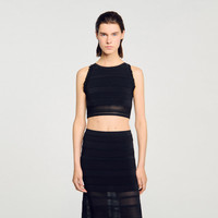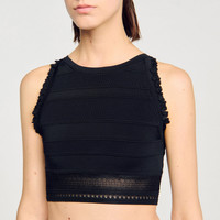 Sleeveless cropped top in a decorative knit, with a round neck and ruffled trim on the sleeve outline. - Sandro Women's decorative knit cropped top - Round neck - Sleeveless - Ruffled trim - Designed for a cropped fit This top matches the Reference: SFPPU02570_20 COMPOSITION & CARE Composition - Main fabric: 82% viscose, 16% polyamide, 2% elastane - Secondary fabric: 100% viscose - Band: 87% viscose, 11% polyamide, 2% elastane Care advice - Hand wash - Do not bleach - Do not tumble dry - Iron at a maximum temperature of 110°C without steam - F - Professional dry clean, with hydrocarbon solvent, normal treatment