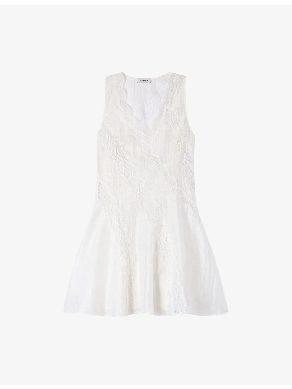 PRODUCT DETAILS - Sandro linen-blend dress - 86% linen, 14% polyester - Concealed fastening - Regular fit, V-neck with scalloped trim, sleeveless, all-over textured design - Hand wash - True to size - Model is 5ft 11in/1.80m and wears a size UK 8 - Midweight, non-stretch Ref: R04615684