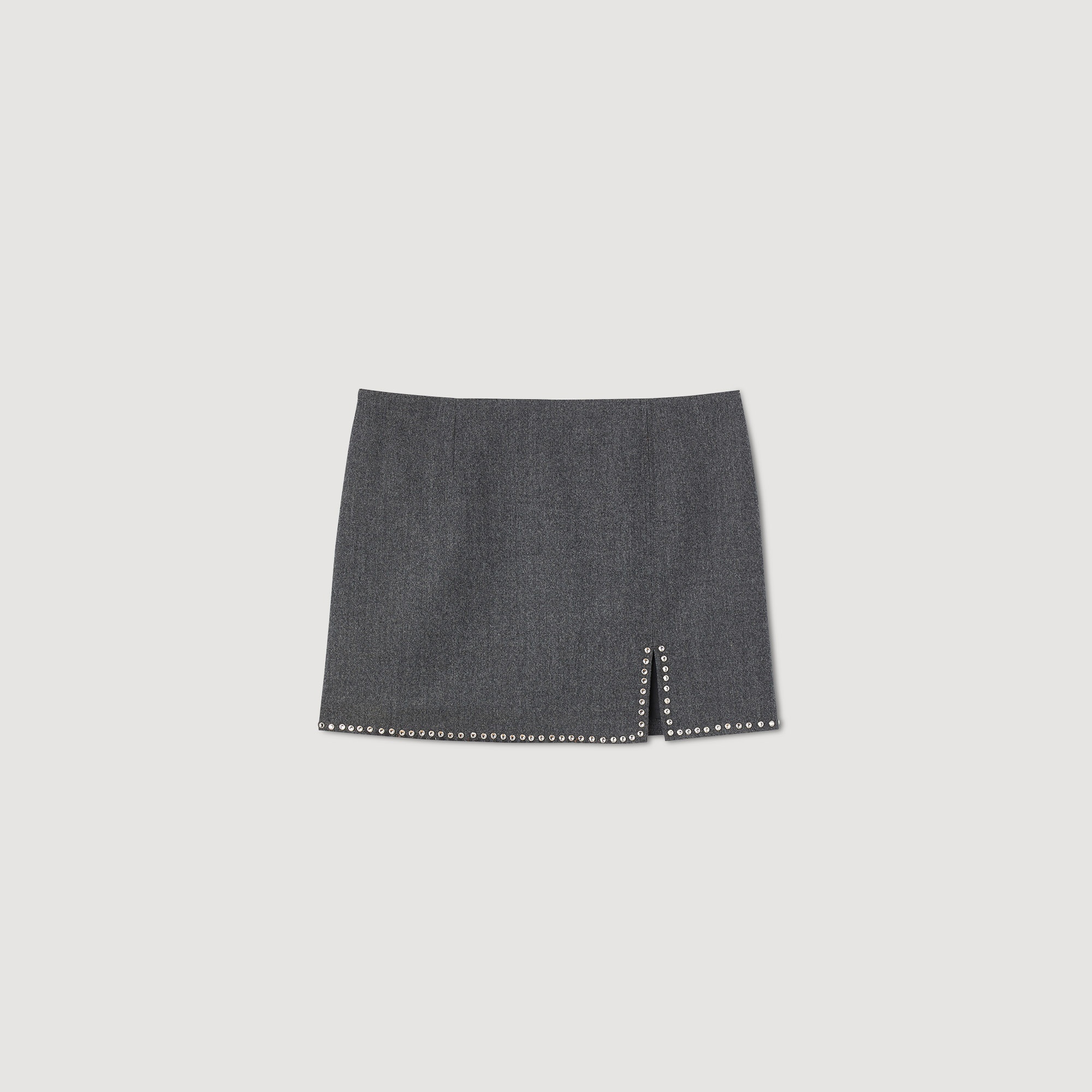 Wool mini skirt with rhinestone embellished side slit. Sandro Women's mini skirt Rhinestone embellished slit Darts at front and back The model is 178 cm / 5'10" tall and wears a size 36 FR / 8 UK Reference : SFPJU00981 MATERIALS Main fabric: 100% wool Diamante: 50% glass, 50% copper Lining: 100% polyester