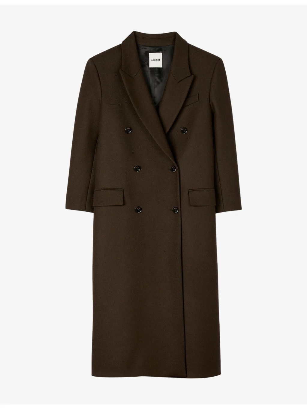 PRODUCT DETAILS - Sandro wool-blend coat - 75% wool, 25% polyamide - Exposed button fastening at front - Regular fit, peak lapels, welt pocket at chest, long sleeves, double breasted design, two flap pockets at the side - Dry clean - True to size - Model is 5ft 9in/1.75m and wears a size UK 8 - Midweight, non-stretch Ref: R04501213