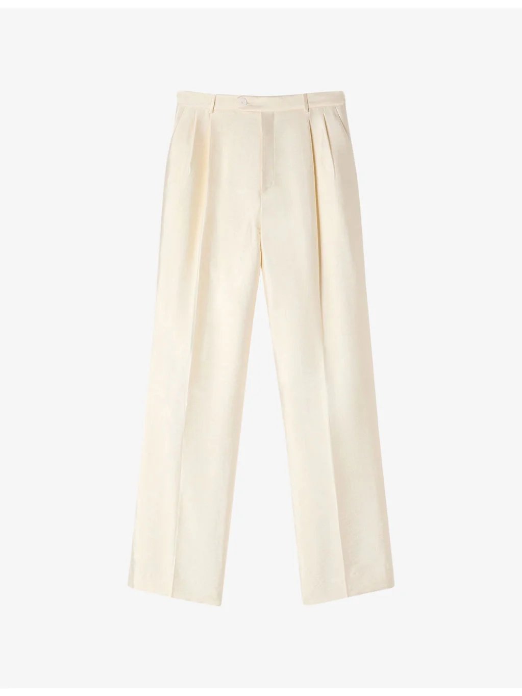 PRODUCT DETAILS - Sandro satin trousers - 50% viscose, 43% cotton, 7% polyamide - Button and zip-fly fastening - Regular fit, high-rise, straight leg, belt loops, side pockets, back pockets, pressed creases - Dry clean - True to size - Model is 5ft 9in/1.75m and wears a size UK 8 - Lightweight, non-stretch Ref: R04598532
