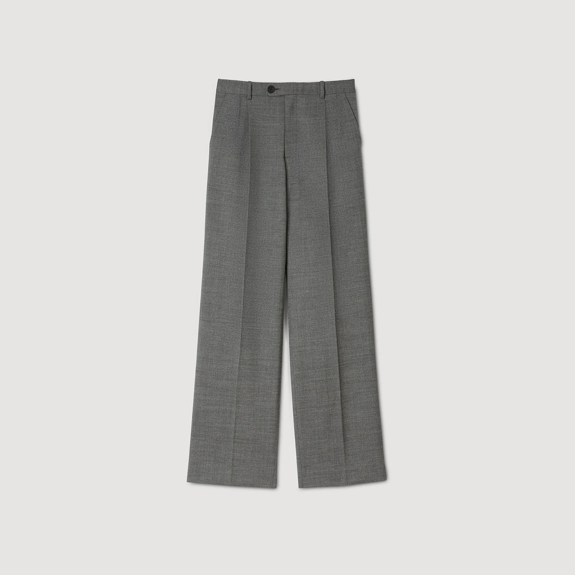 Straight-leg, wide trousers with pleat details at the waist and ironed creases down the leg. - Sandro Women's wool trousers - Ironed creases down the leg - Slanting pockets - Buttoned welt pockets on the back - Belt loops - True to size Reference: SFPPA01769_24 COMPOSITION & CARE Composition - Main material: 55% wool, 41% polyester, 4% elastane - Lining: 100% cotton - Fusible interfacing: 100% polyester - Belt lining: 91% cotton, 9% polyester Care advice - Do not wash - Do not bleach - Do not tumble dry - Iron at a maximum temperature of 110°C without steam - F/ - Professional dry clean, with hydrocarbon solvent, gentle treatment