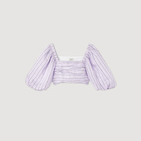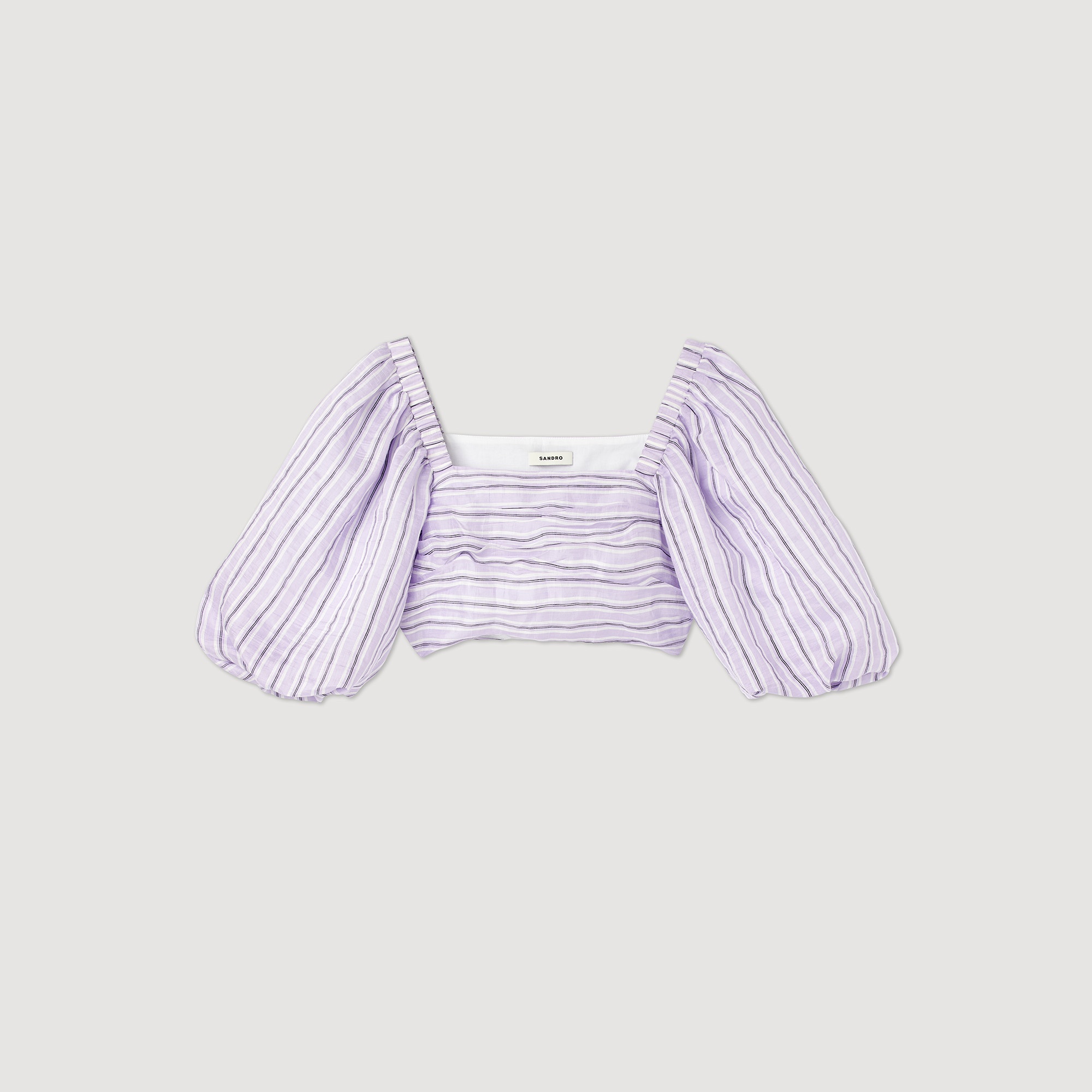 Gathered crop top with full short sleeves and a square neckline, embellished with a striped print. Sandro Women’s striped crop top Square neckline Full short sleeves Elasticated on lower sleeve Zipper This top has a matching skirt Reference : SFPTO00585 MATERIALS Main fabric: 86% linen, 14% polyester Lining: 100% cotton
