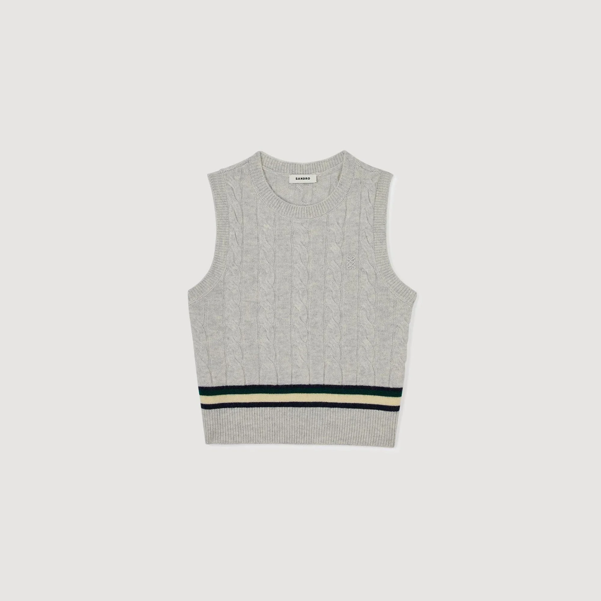 Sleeveless cropped cable knit sweater with contrasting stripes, round neck and tone-on-tone embroidery. - Sandro Women's cropped cable knit sweater - Wool and cashmere - Round neck - Sleeveless - Contrasting stripes - Tone-on-tone chest embroidery - Ribbed trim - True to size Reference: SFPPU02651_24 COMPOSITION & CARE Composition - Main fabric: 90% wool, 10% cashmere - Embroidery: 100% polyester - Rib: 85% wool, 10% cashmere, 5% polyamide Care advice - Hand wash - Do not bleach - Do not tumble dry - Iron at a maximum temperature of 110°C without steam - F - Professional dry clean, with hydrocarbon solvent, normal treatment
