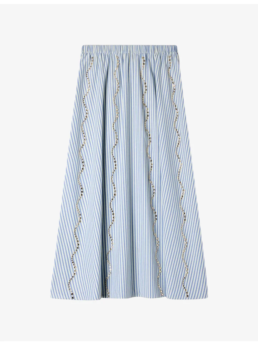PRODUCT DETAILS - Sandro cotton-blend skirt - 55% polyester, 45% cotton - Regular fit, elasticated waist, all-over stripe print, rhinestone embellishment - Machine wash at 30°C - True to size - Model is 5ft 11in/1.80m and wears a size UK 8 - Midweight, non-stretch Ref: R04618194
