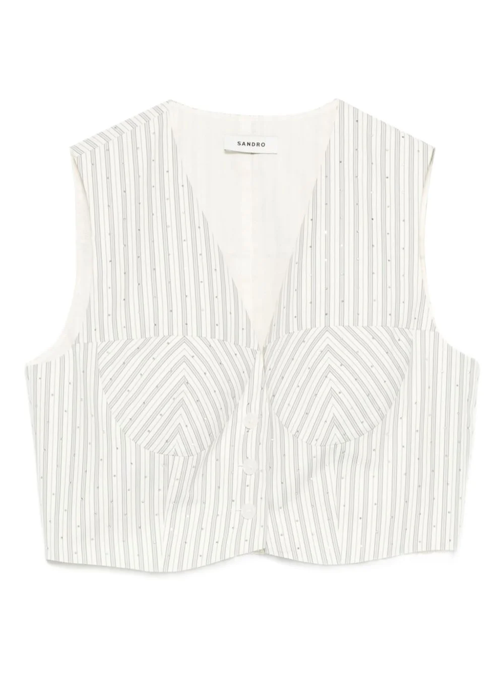 striped rhinestone-embellished crop top Highlights - Cream white - Striped - Rhinestone embellishment - V-neck - Sleeveless - Button fastening Imported Composition Outer: Polyester 63%, Cotton 37% Lining: Cotton 100% SIZE & FIT Model measurements Height 5 ft 9 in(1.76 m) Bust/Chest 32.28 in(82 cm) Hips 35.43 in(90 cm) Waist 25.19 in(64 cm) Washing instructions Hand Wash