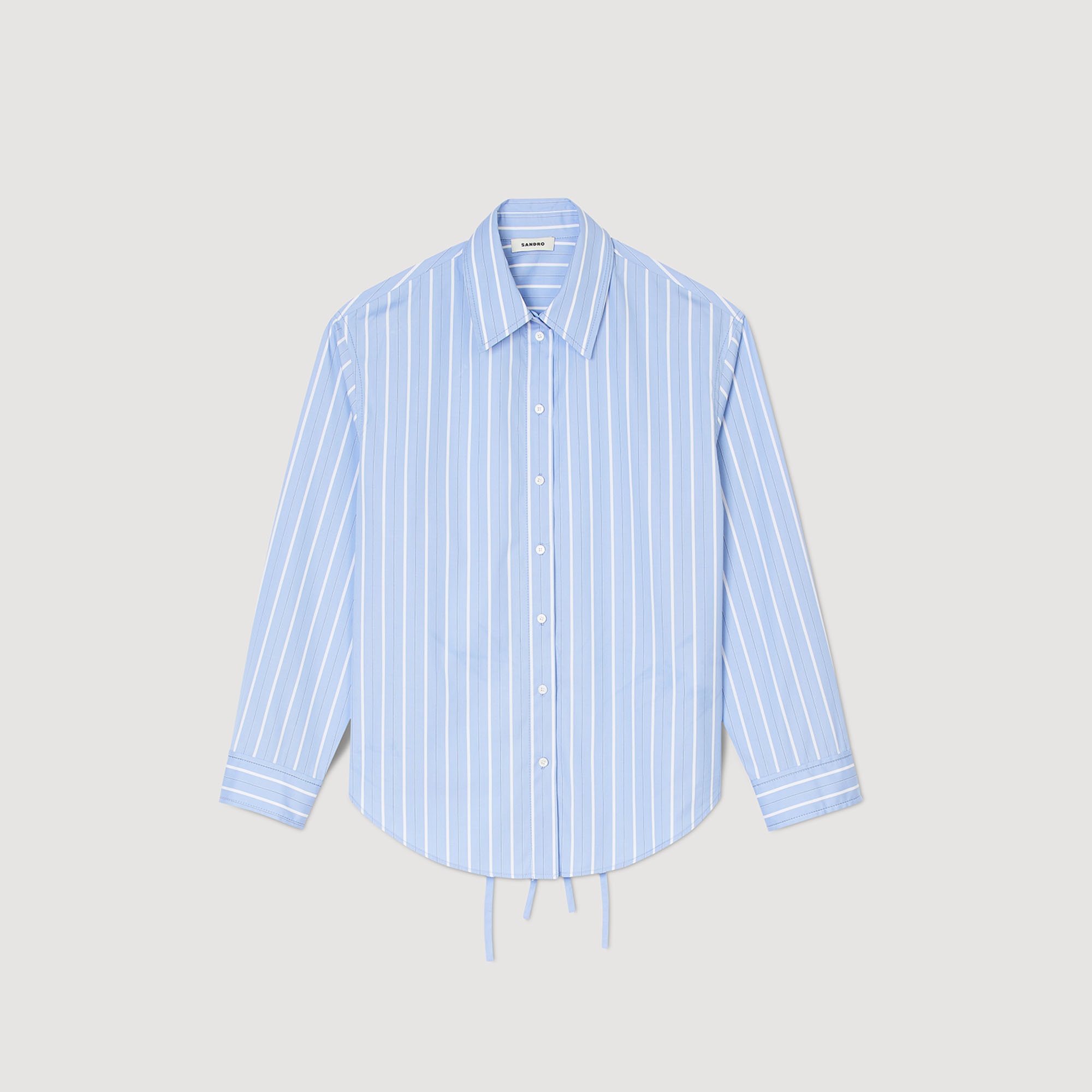 Stripy cotton poplin shirt with shirt collar, long sleeves, button fastening, open back and embellished with lace strips and ties. Sandro Women's cotton poplin shirt Striped Shirt collar Long sleeves Button fastening Open back with ties and lace Shirt hem The model is 177 cm / 5'9" tall and wears a size 1 FR / 8 UK Reference : SFPCM01108 MATERIALS Main fabric: 100% cotton Buttons: 100% nacre Braid: 100% cotton