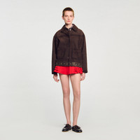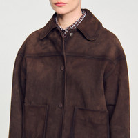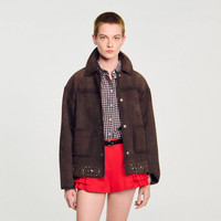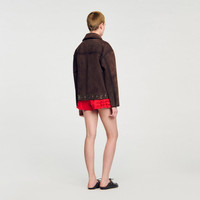 Suede jacket embellished with studs, featuring a shirt collar, long sleeves with buttoned cuffs, button placket fastening and patch pockets. - Sandro Women's suede jacket - Shirt collar - Long sleeves with buttoned cuffs - Button placket fastening - Patch pockets - Studded pattern on lower body - True to size Reference: SFPBL01163_G023 COMPOSITION & CARE Composition - Main material: lambskin split leather - Sleeve lining: 100% polyester Care advice - Do not wash - Do not bleach - Do not tumble dry - Do not iron - Do not dry clean