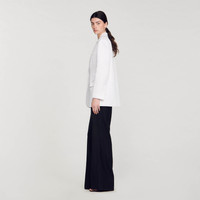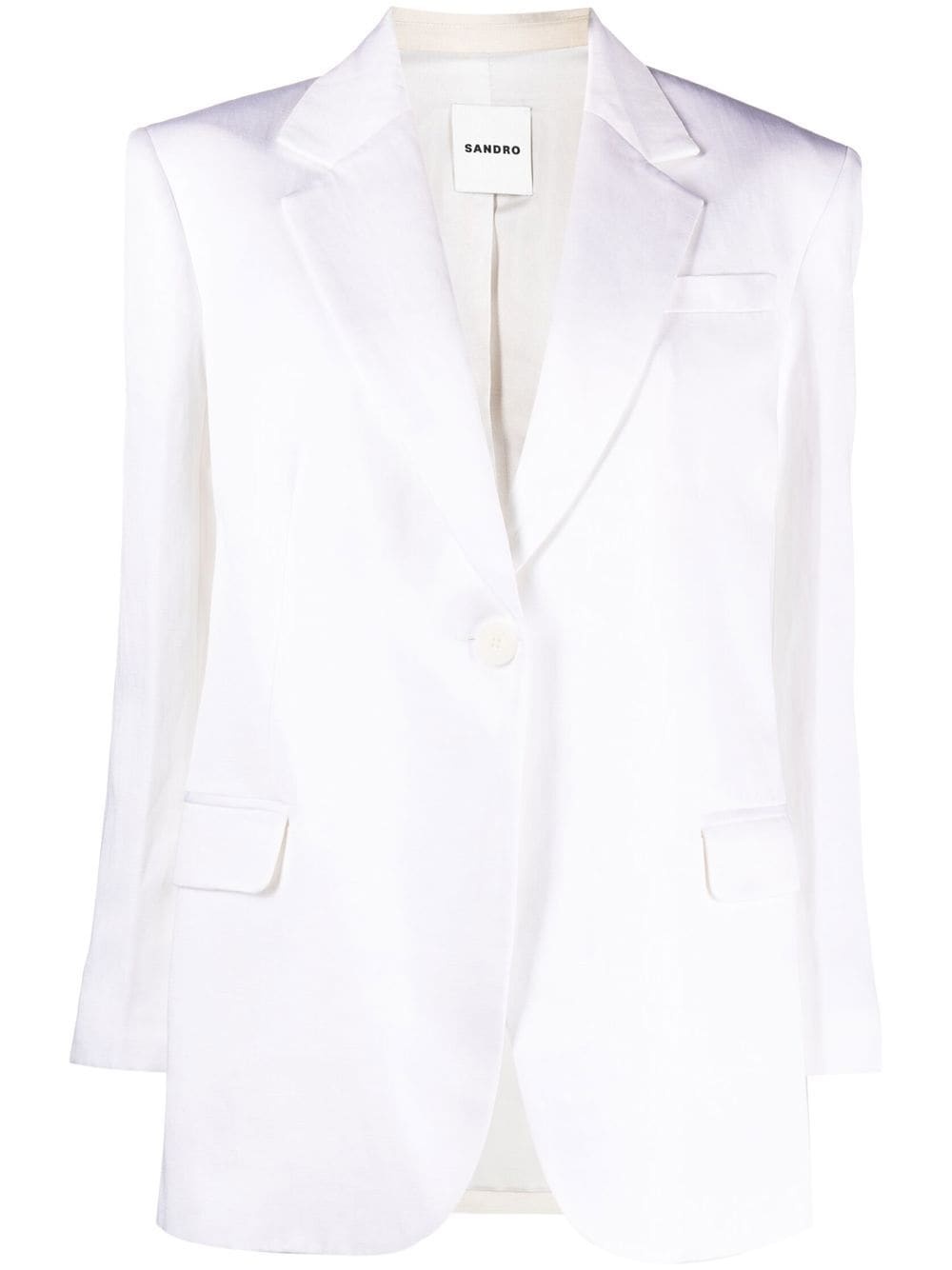 single-breasted cotton blazer French label Sandro seamlessly blends modern style and heritage, as seen with this single-breasted blazer. The tailored garment is imagined in a sleek white hue for SS23. Imported Composition Outer: Polyester 100%, Viscose 55%, Linen/Flax 36%, Cotton 9% Lining: Viscose 100%, Cotton 100% SIZE & FIT Model measurements Height 5 ft 10 in(1.78 m) Bust/Chest 31.5 in(80 cm) Hips 35 in(89 cm) Waist 23.6 in(60 cm) FittingInformation This piece fits true to size. We recommend you get your regular size Cut for a loose fit Made with a mid-weight non-stretch fabric