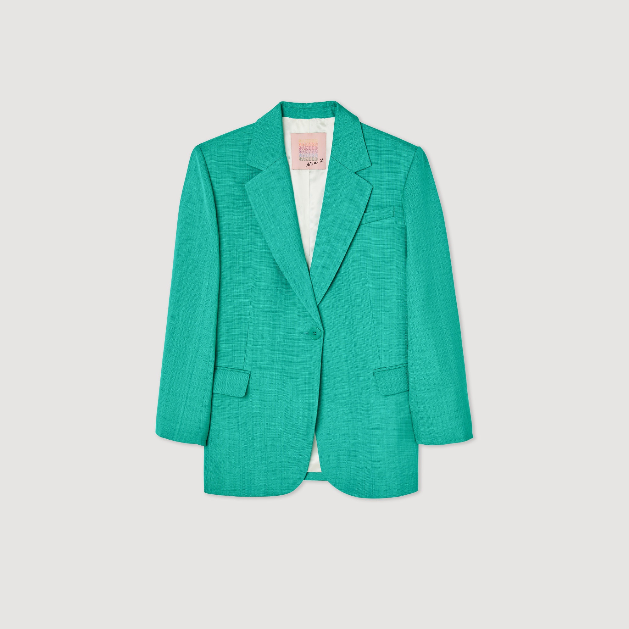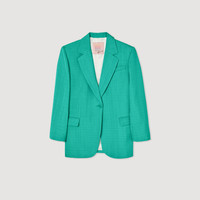 Tailored jacket with long sleeves, a button fastening, and flap pockets. Sandro Women's tailored jacket Long sleeves 1 button 2 flap pockets Piped pocket on the chest Back vent The model is 5'8" tall and wears a size 36 FR / 4 US These jacket have a matching pant Reference : SFPVE00815 MATERIALS Main fabric: 100% viscose Under collar: 100% polyester Lining: 100% viscose Pocket lining: 100% cotton