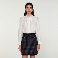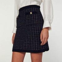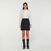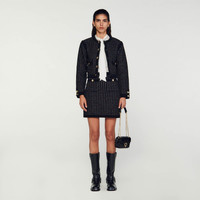Short skirt made of shimmering tweed style textured knit with piped pockets adorned with decorative buttons and a braided, velvet style belt on the waist. Sandro women's short knit skirt Shiny tweed look Braided velvet style details 2 buttoned piped pockets Zip-up front Pair with the matching cardigan . The model is 177 cm / 5'9 tall and wears a size 36 FR / 8 UK COMPOSITION Main fabric: 64% polyester, 13% wool, 12% metalized fibers, 6% polyamide, 5% cotton Braid: 96% polyester, 3% polyamide, 1% elastane Rib: 96% polyester, 3% polyamide, 1% elastane Reference: SFPJU00994_20