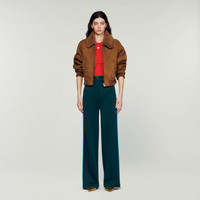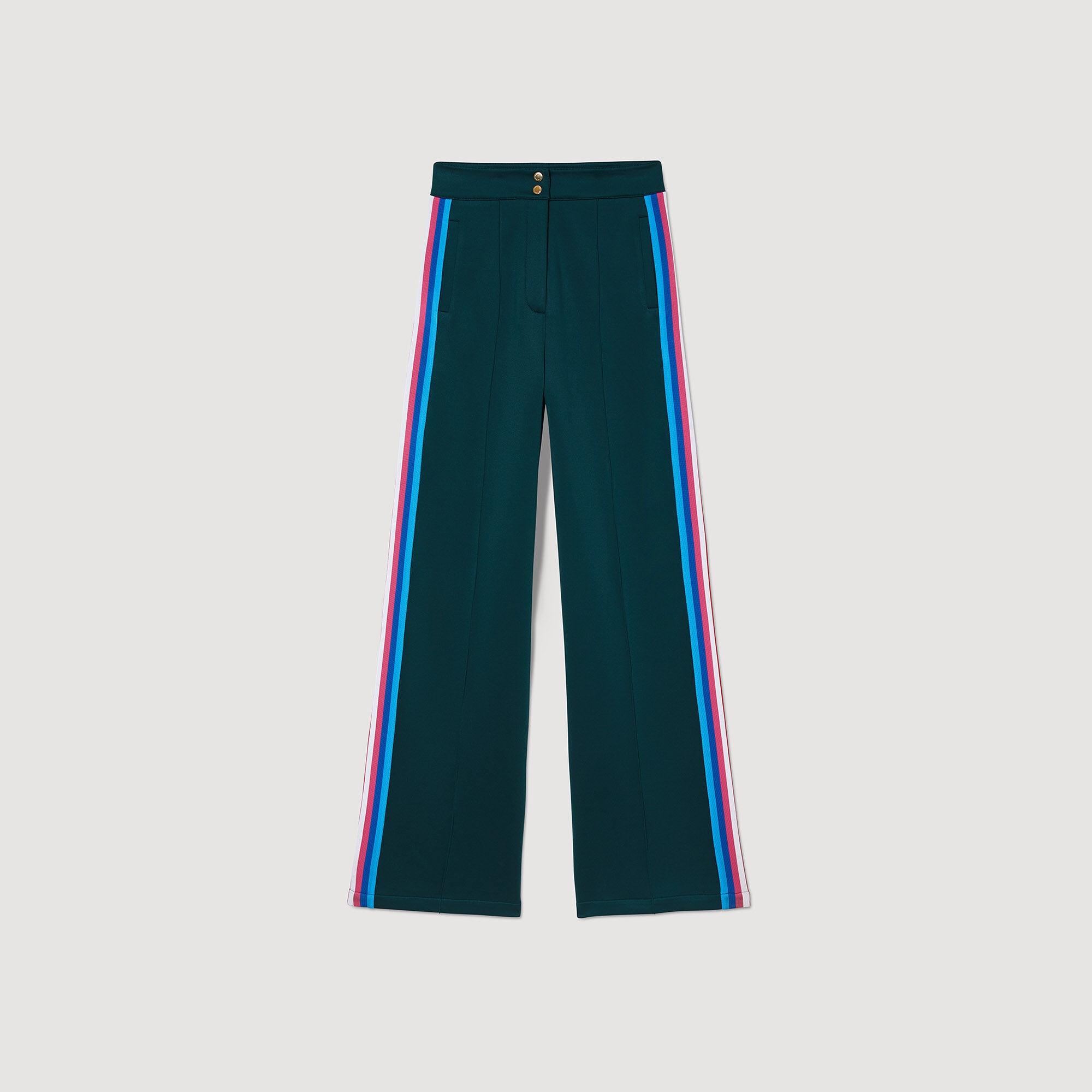 Wide-leg pleated joggers-style trousers embellished with multicoloured side stripes and pockets. Sandro Women's jogging bottoms Multicoloured side stripes Pleats Welt pockets Press studs The model is 177 cm / 5'9" tall and wears a size 36 FR / US 4 This item's main material is at least 50% recycled. Recycling reduces the environmental impact by limiting the use of virgin materials. The model is 180 cm / 5'11 tall and wears a size 36 FR / 8 UK COMPOSITION Main fabric: 94% polyester, 6% elastane Band: 100% polyester Pocket lining: 100% cotton Reference: SFPPA01254_100