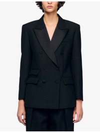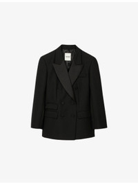 PRODUCT DETAILS - Sandro wool-blend jacket - 55% polyester, 45% wool - Exposed button fastening at front - Regular fit, satin peak lapels, long sleeves, two flap pockets at the side - Dry clean - True to size - Model is 5ft 9in/1.75m and wears a size UK 8 - Midweight, non-stretch Ref: R04512068