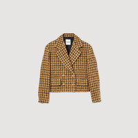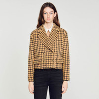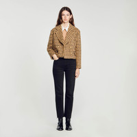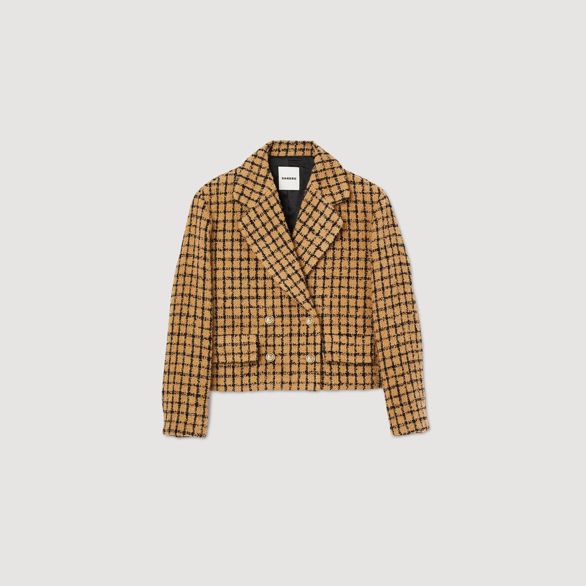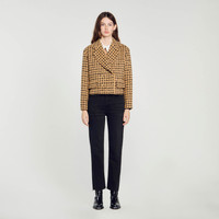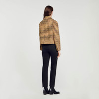 Short tweed check jacket featuring a large lapel collar, double-breasted buttons and flap pockets on the waist. Sandro Women's tweed cropped jacket Big lapel collar Double-breasted Long sleeves Gold buttons The model is 178 cm / 5'10" tall and wears a size 36 FR / 8 UK Reference : SFPVE00922 MATERIALS Main fabric: 63% acrylic, 23% virgin wool, 14% polyamide Under collar: 100% polyester Lining: 100% viscose Pocket lining: 100% cotton