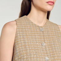 Sleeveless illusion-effect crop top with round neck and rhinestone buttons. Sandro Women's tweed crop top Round neck Sleeveless Rhinestone buttons This top matches the trousers The model is 177 cm / 5'10 tall and wears a size 1 FR / S COMPOSITION Main fabric: 45% cotton, 27% acrylic, 13% polyester, 12% polyamide, 3% other fibres Lining: 100% polyester Reference: SFPTO00722_13