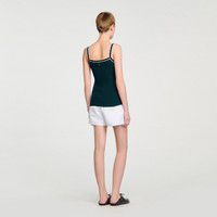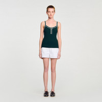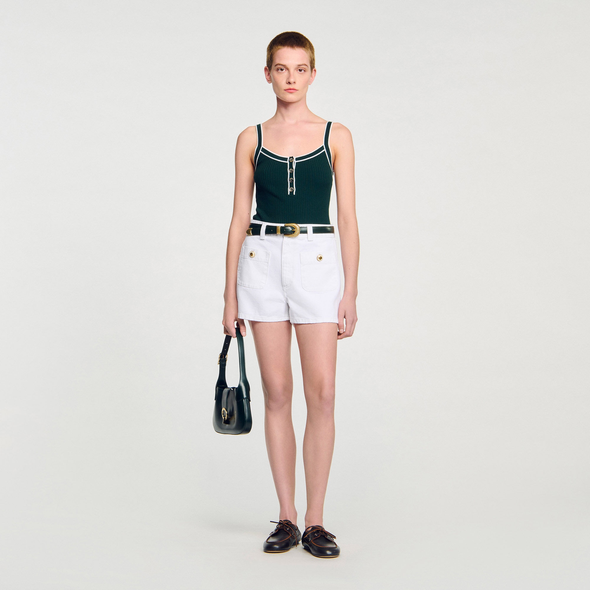 Fine rib knit vest top with contrasting finishes, featuring straps and a button placket with decorative buttons. - Sandro Women's rib knit vest top - Straps - Button placket - Decorative buttons - Contrasting finishes - Designed for a slim fit Reference: SFPPU02647_100 COMPOSITION & CARE Composition - Main fabric: 53% viscose, 27% lyocell, 14% polyamide, 6% silk Care advice - Hand wash - Do not bleach - Do not tumble dry - Iron at a maximum temperature of 110°C without steam - F - Professional dry clean, with hydrocarbon solvent, normal treatment