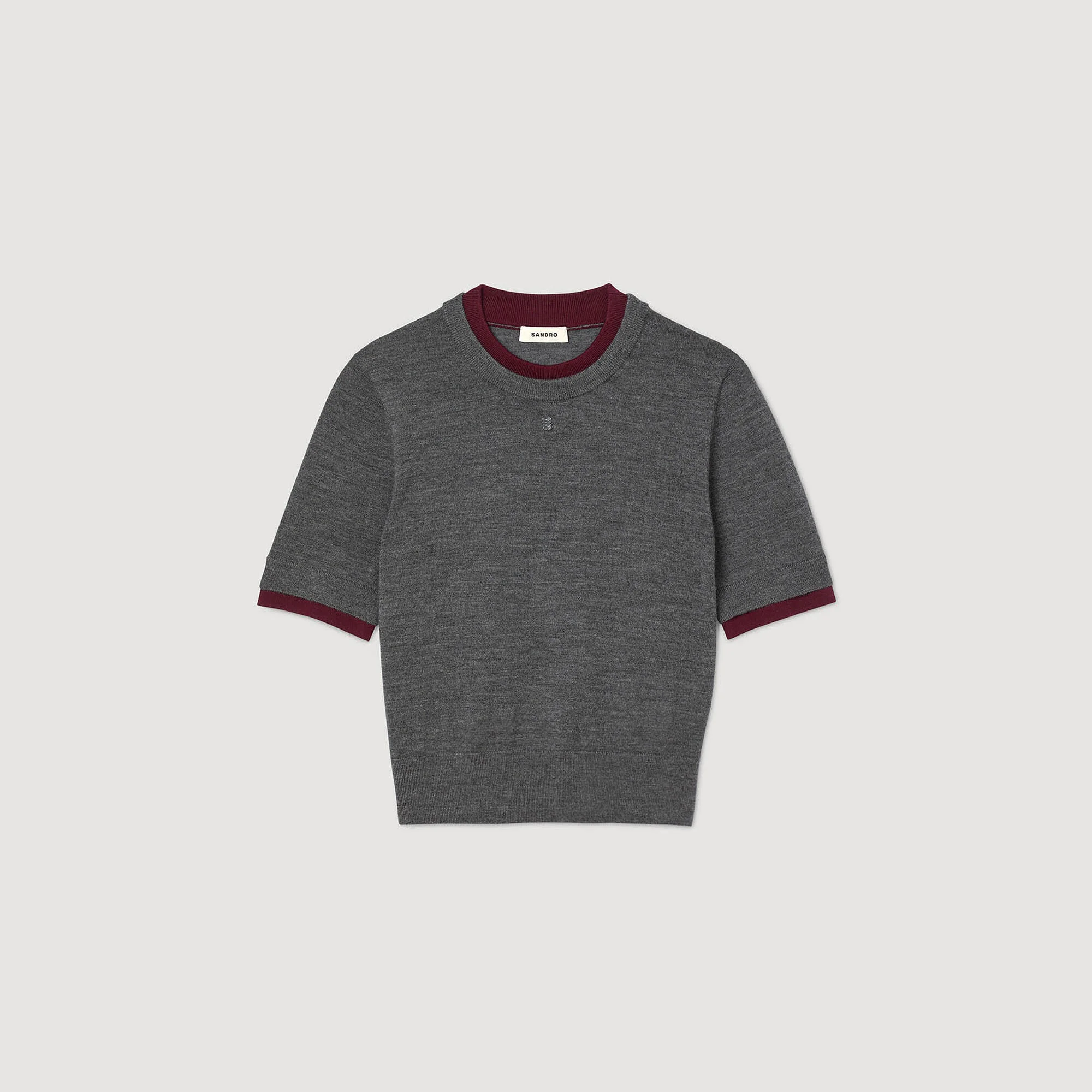 Short fine knit sweater with round neck and short sleeves with contrasting trim, adorned with a signature tag. - Sandro Women's short knit sweater - Round neck - Short sleeves - Double contrasting trim - Ribbed edges - True to size Reference: SFPPU02645_24 COMPOSITION & CARE Composition - Main fabric: 100% wool - Collar: 58% cotton, 24% viscose, 16% polyamide, 2% elastane - Rib: 84% wool, 14% polyamide, 2% elastane Care advice - Hand wash - Do not bleach - Do not tumble dry - Iron at a maximum temperature of 110°C without steam - F/ - Professional dry clean, with hydrocarbon solvent, gentle treatment