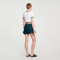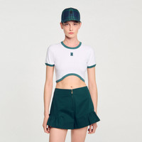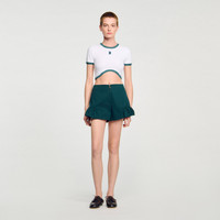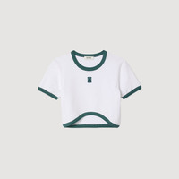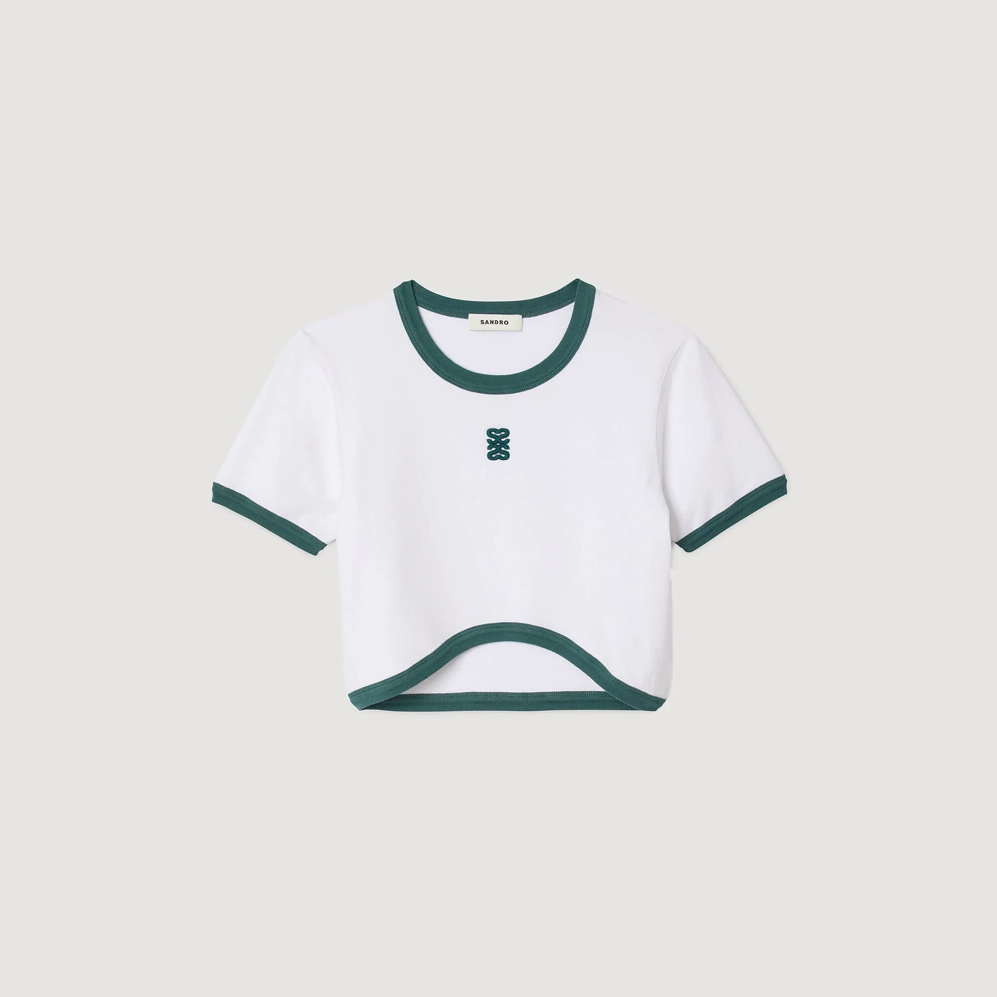 Two-tone cropped T-shirt with round neck and short sleeves, embellished with embroidery and contrasting finish. - Sandro Women's cotton T-shirt - Round neck - Short sleeves - Wavy hem at the front - Contrasting embroidery and edges - Designed for a cropped fit Reference: SFPTS01682_10 COMPOSITION & CARE Composition - Main fabric: 95% cotton, 5% elastane - Rib: 100% cotton Care advice - Gentle cycle 30° - Do not bleach - Do not tumble dry - Iron at a maximum temperature of 110°C without steam - Do not dry clean