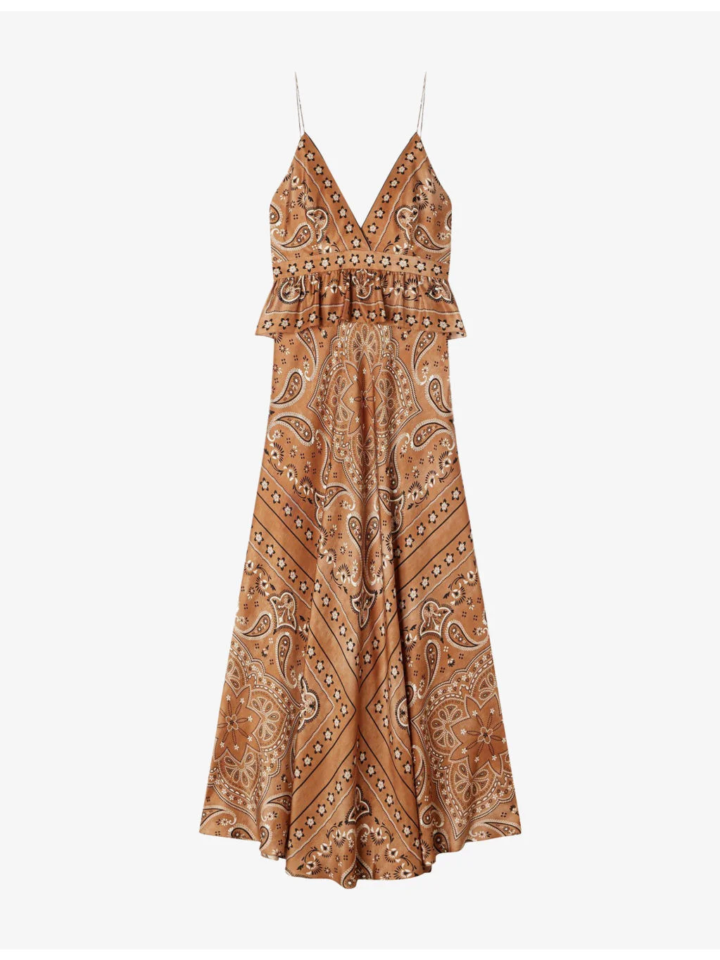 PRODUCT DETAILS - Sandro woven dress - 100% polyester - Self-tie fastening - Regular fit, V-neck, narrow straps, frill detail at the waist, elasticated back panel, all-over bandana print - Machine wash mild - True to size - Model is 5ft 9in/1.75m and wears a size UK 8 - Lightweight, non-stretch Ref: R04598575