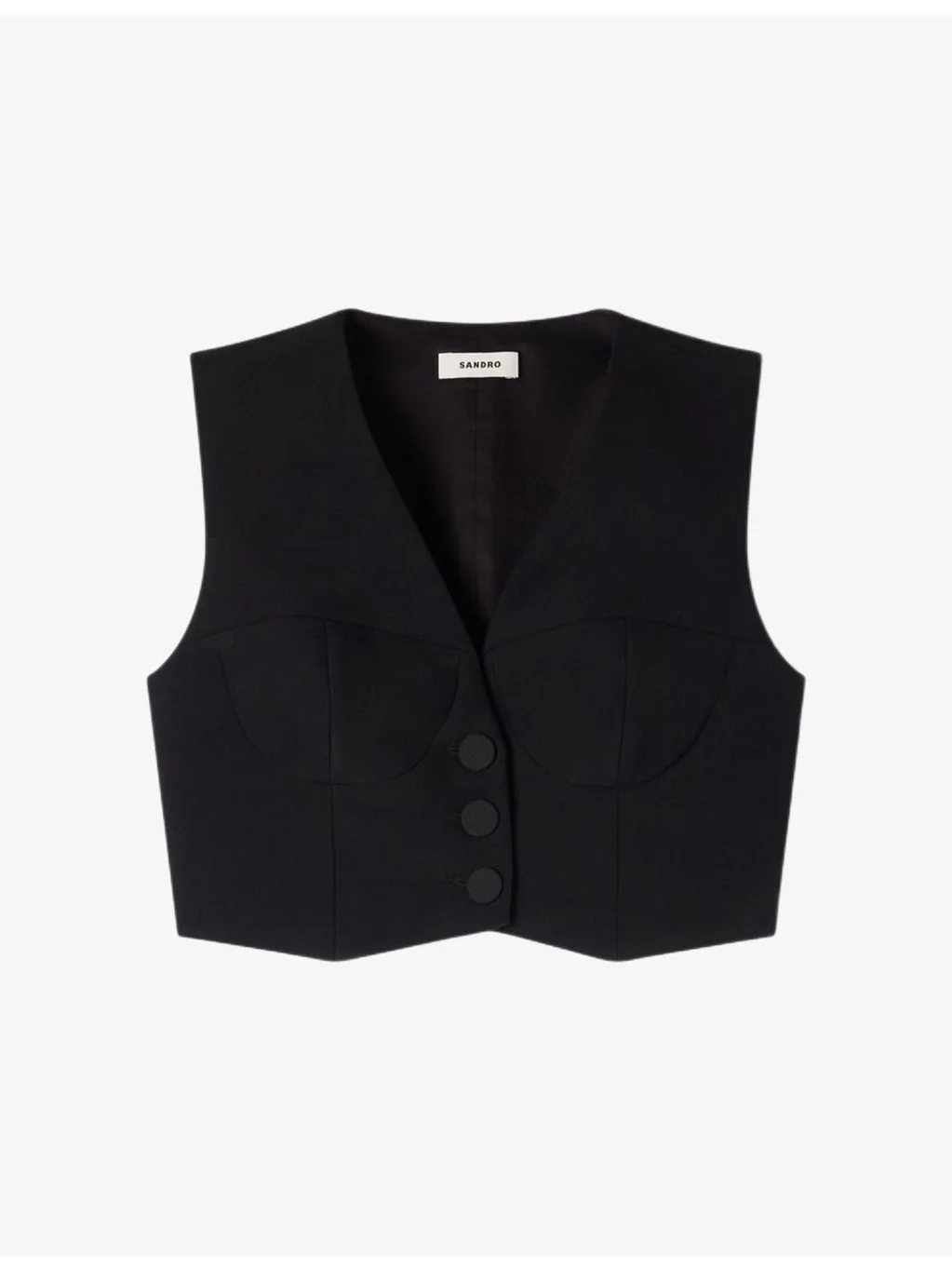 PRODUCT DETAILS - Sandro woven top - 55% polyester, 45% wool - Button fastening - Regular fit, V-neck, sleeveless, corset-style tailoring, cropped - Dry clean - True to size - Model is 5ft 11in/1.80m and wears a size UK 8 - Lightweight, non-stretch Ref: R04578765
