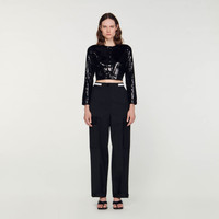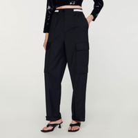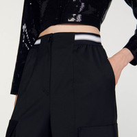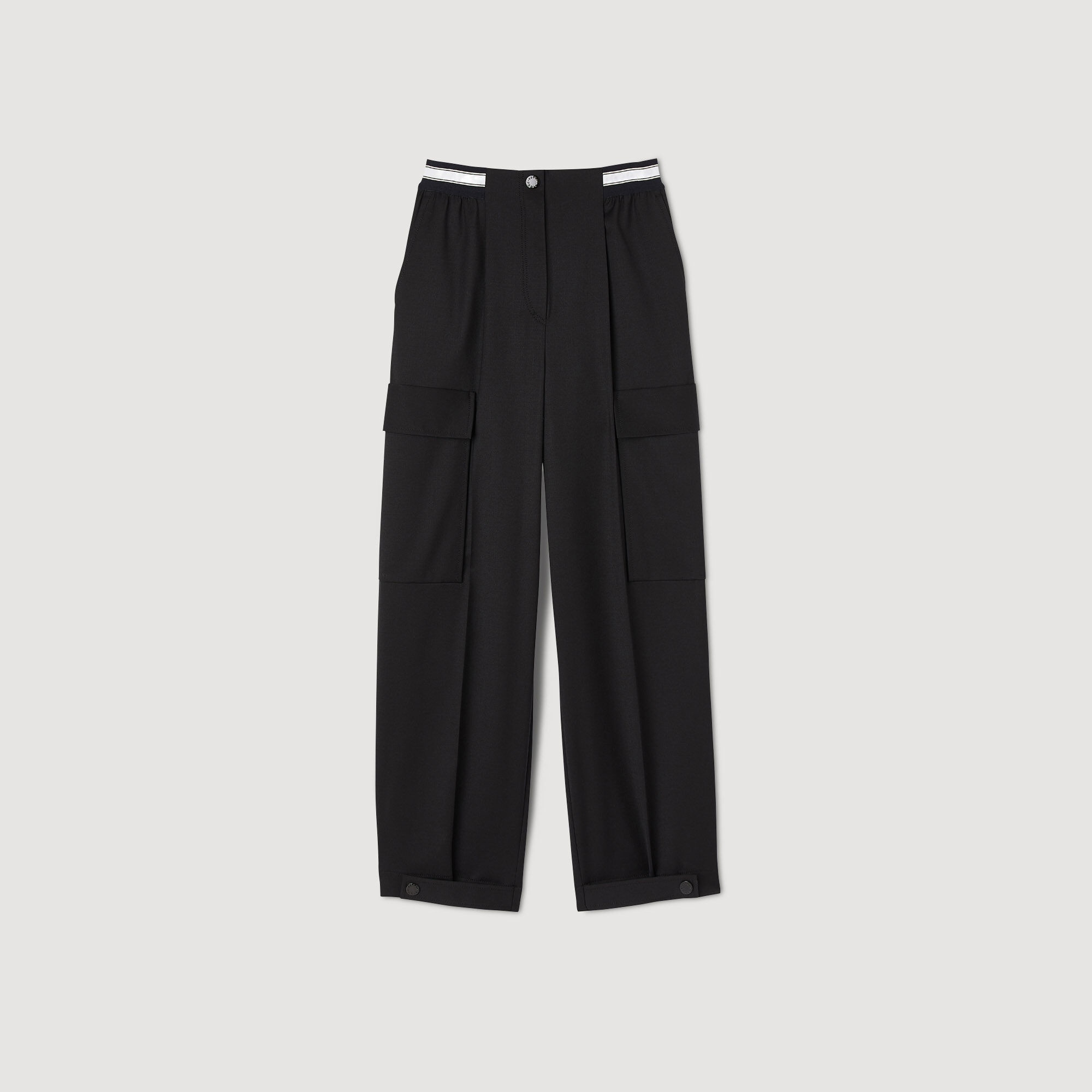 Wide-leg cargo pants with a contrasting elasticated waistband featuring SANDRO branding, gathering at the waist, and large patch flap pockets on the sides. Sandro Women's cargo pants Contrasting elasticated waist Gathered at the waist Large bellows pockets on the sides Button tabs at the ankles This item's main material is at least 50% recycled. Recycling reduces the environmental impact by limiting the use of virgin materials. The model is 178 cm / 5'10 tall and wears a size 36 FR / 8 UK COMPOSITION Main fabric: 54% polyester, 44% virgin wool, 2% elastane Pocket lining: 100% cotton Reference: SFPPA01205_20