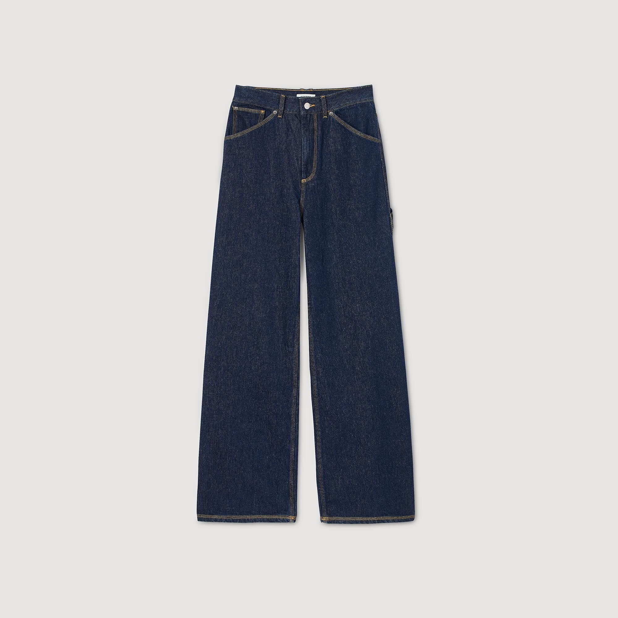 Wide-leg, flared raw denim jeans with contrast stitching, five pockets and side strap. Sandro Women's wide-leg flared jeans 5 pockets Raw denim Side strap The model is 178 cm / 5'10 tall and wears a size 36 FR / 4 US COMPOSITION Main fabric: 100% cotton Lining: 65% polyester, 35% cotton Reference: SFPJE00628_4785