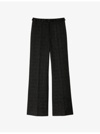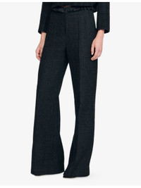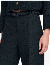 PRODUCT DETAILS - Sandro tweed trousers - 100% polyester - Concealed zip fastening at the front - Slim fit, high rise, ruffle trim, wide leg, tweed finish - Dry clean - True to size - Model is 5ft 9in/1.75m and wears a size UK 8 - Midweight, non-stretch Ref: R04501229