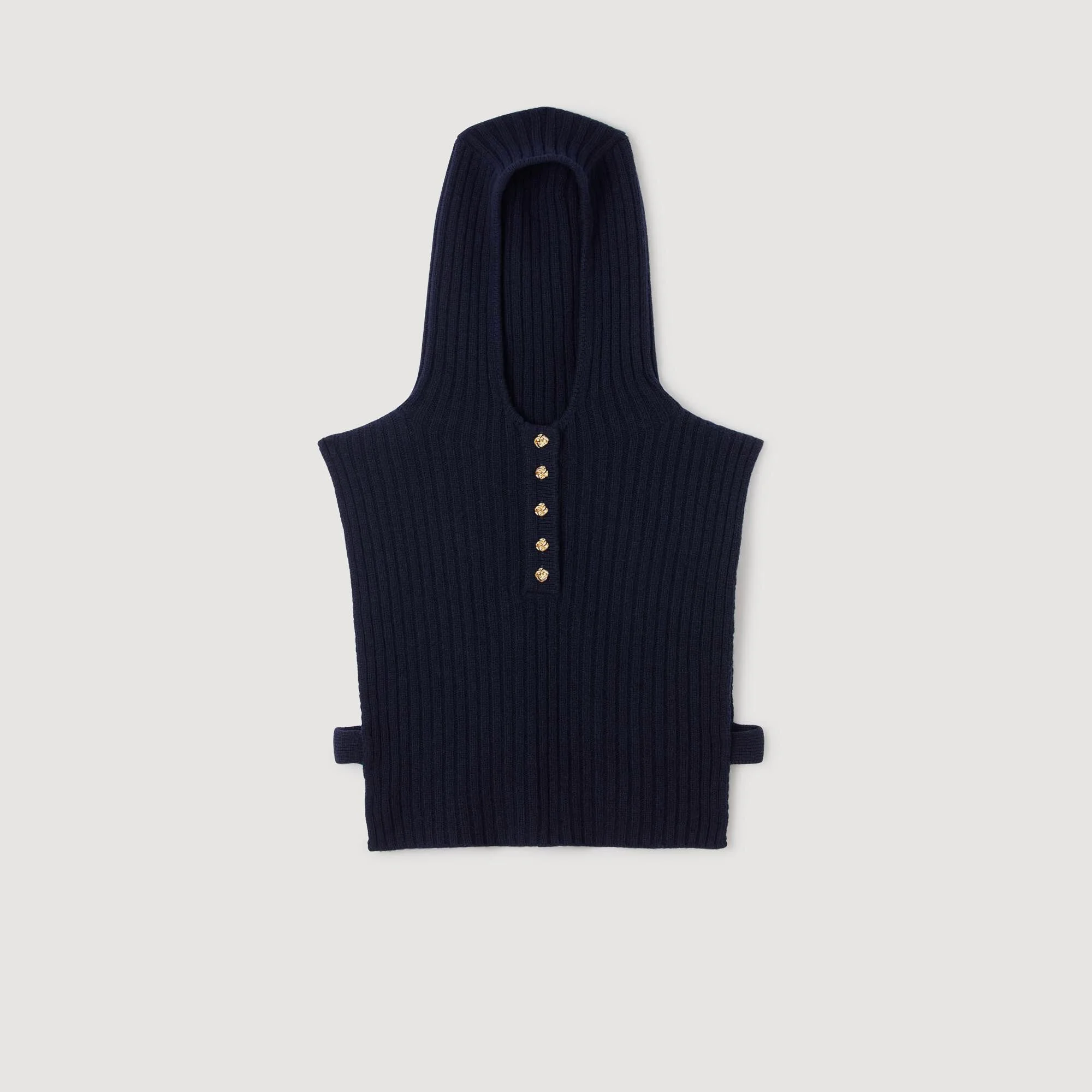 Ribbed wool knit collar with hood and front buttons. - Sandro Women's ribbed wool knit collar - Hood - Buttoned - Pull-on - SANDRO tag Reference: SFABO01131 COMPOSITION & CARE Composition - Main fabric: 100% wool Care advice - Hand wash - Do not bleach - Do not tumble dry - Iron at a maximum temperature of 110°C without steam - F - Professional dry clean, with hydrocarbon solvent, normal treatment