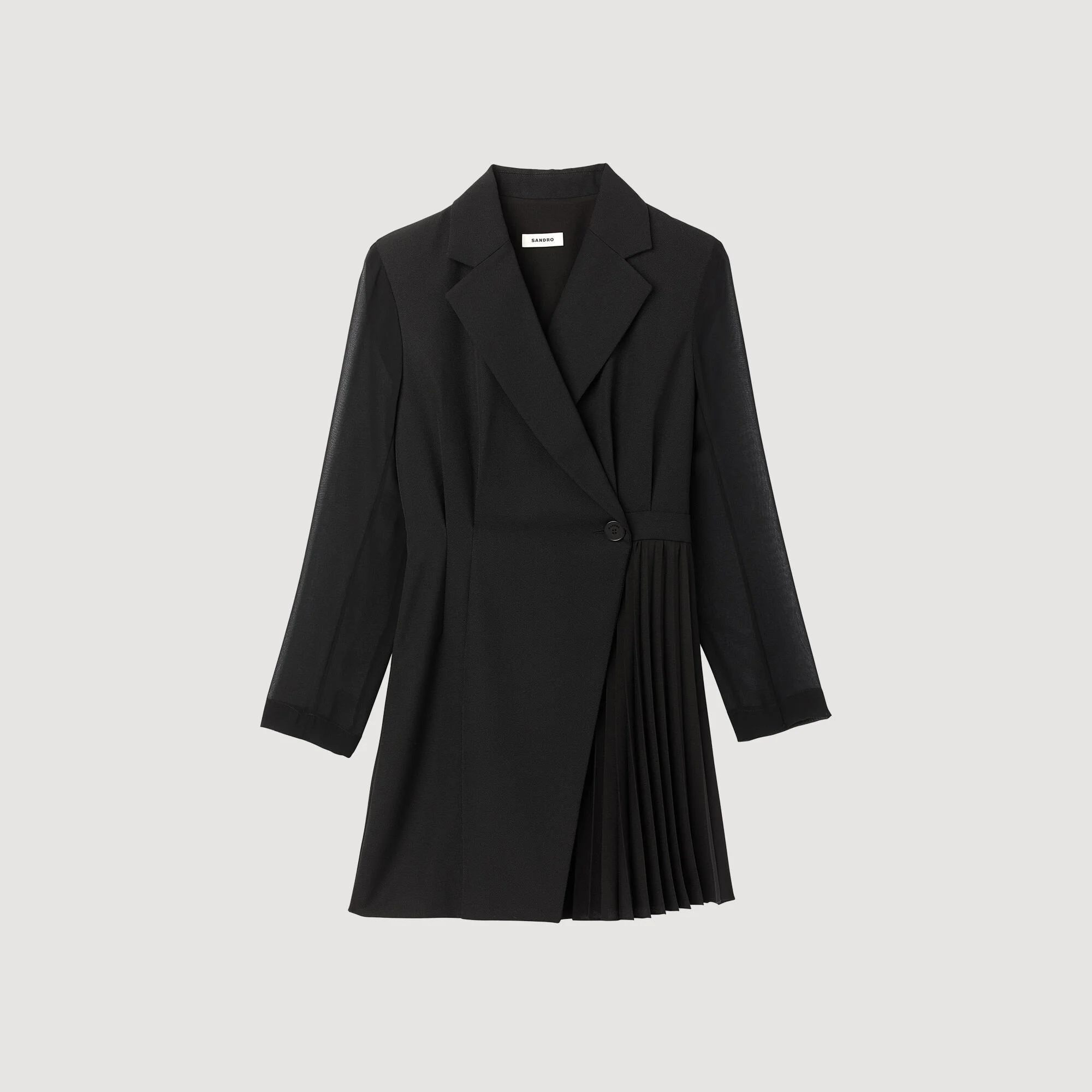 Tailored wraparound dress with long sleeves, a wide collar, and an asymmetrical chiffon skirt with a pleated side. Sandro Women's wraparound dress Long sleeves Tailored collar Button fastening at the side Skirt with pleated side Fitted at the waist The model is 5'9" tall and wears a size 36 FR / 4 US This item's main material is at least 50% recycled. Recycling reduces the environmental impact by limiting the use of virgin materials. The model is 177 cm / 5'9 tall and wears a size 36 FR / 8 UK COMPOSITION Main fabric: 55% polyester, 45% virgin wool Lining: 100% polyester Sleeves: 100% polyester Secondary fabric: 100% polyester Reference: SFPRO02848_20