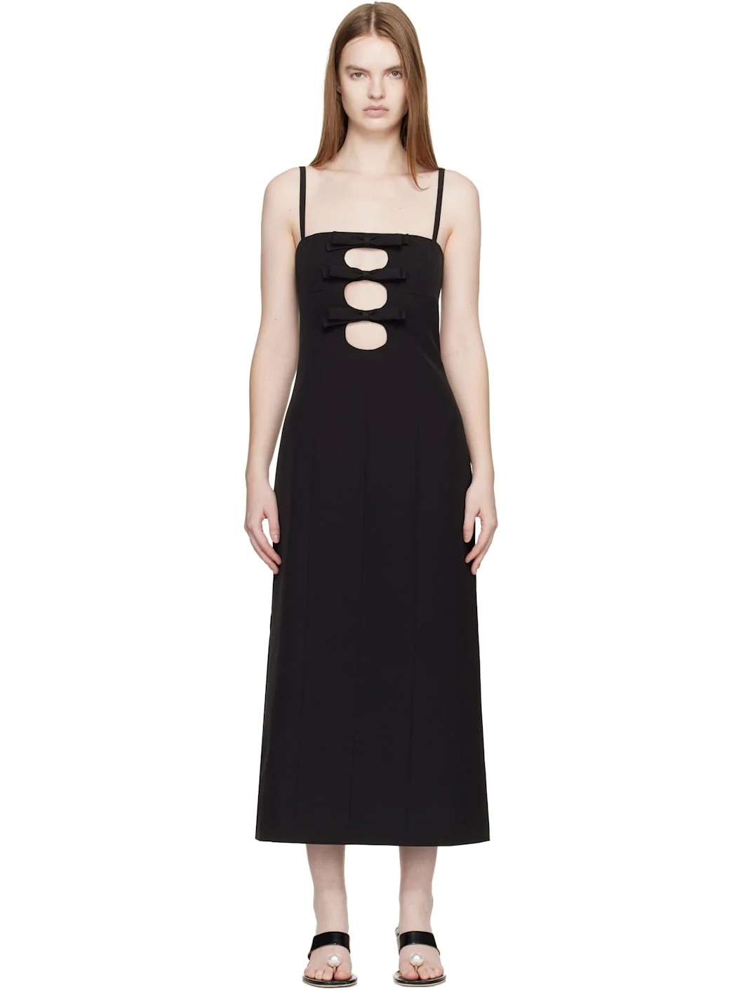 Stretch crepe midi dress. · Square neck · Cutouts and bow accents at front · Adjustable spaghetti straps · Zip closure at low back · Vent at back hem · Full satin lining Supplier color: Black Body: 90% polyester, 10% spandex. Lining: 100% viscose. Made in United States 261677F054002