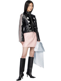 Crinkled vinyl jacket. · Stand collar · Two-way zip closure · Graphic cutouts at front and back · Seam pockets · Striped trim at sleeves · Zip vent at cuffs · Adjustable pin-buckle tabs at back hem · Welt pocket at interior · Full satin lining · Logo-engraved graphic silver-tone hardware Supplier color: Black