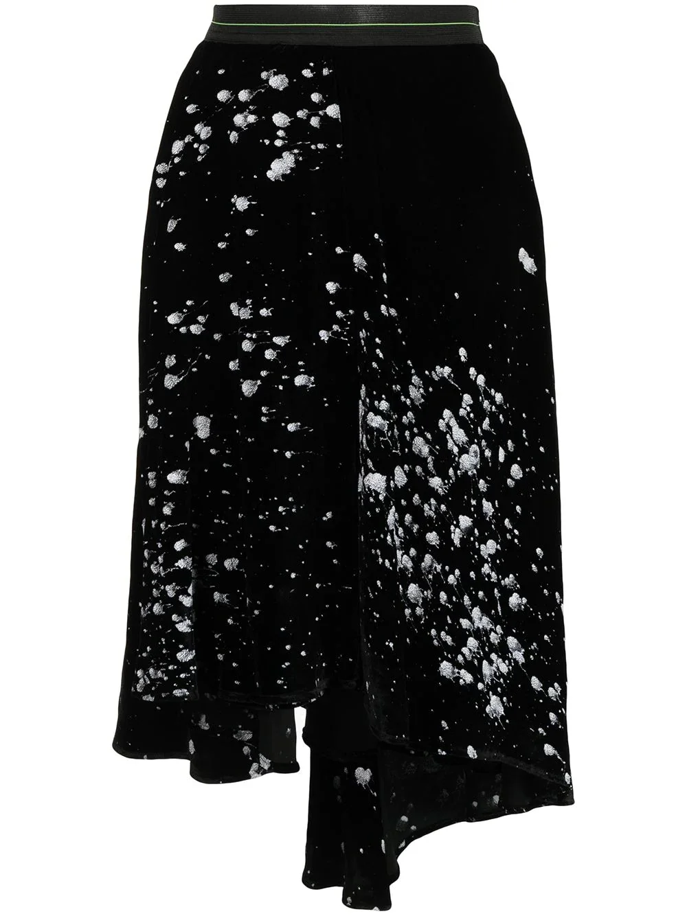 spray-paint velour skirt black/white velour paint splatter detail elasticated waistband gathered detailing asymmetric design Imported Composition Viscose 82%, Silk 18% SIZE & FIT Model measurements Height 5 ft 9 in(1.76 m) Bust/Chest 29.13 in(74 cm) Hips 33.07 in(84 cm) Waist 22.83 in(58 cm) Washing instructions Dry Clean Only