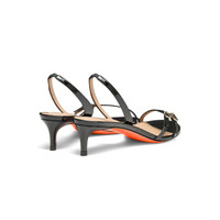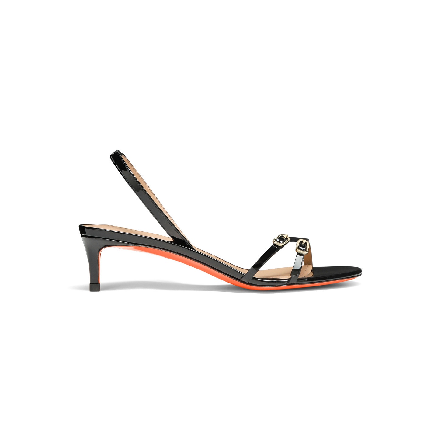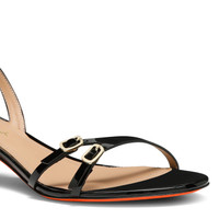 Sophisticated yet easy to wear, this mid-heel sandal brings exclusive elegance to casual and evening looks alike. Crafted from shiny patent leather, it’s characterised by sophisticated straps that recall the iconic lines of our hallmark double buckle. Styled with a stiletto heel and a contrast leather sole in signature Arancio Santoni. Product details Product ID: WHQX71496HA2NVHDN01 - Crafted from patent leather - Color: black - Almond-shaped toe - Double-buckle-inspired strap closure - Leather sole - 4.5 cm stiletto heel - Printed Santoni logo on the insole - Made in Le Marche, Italy