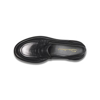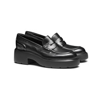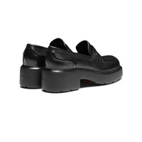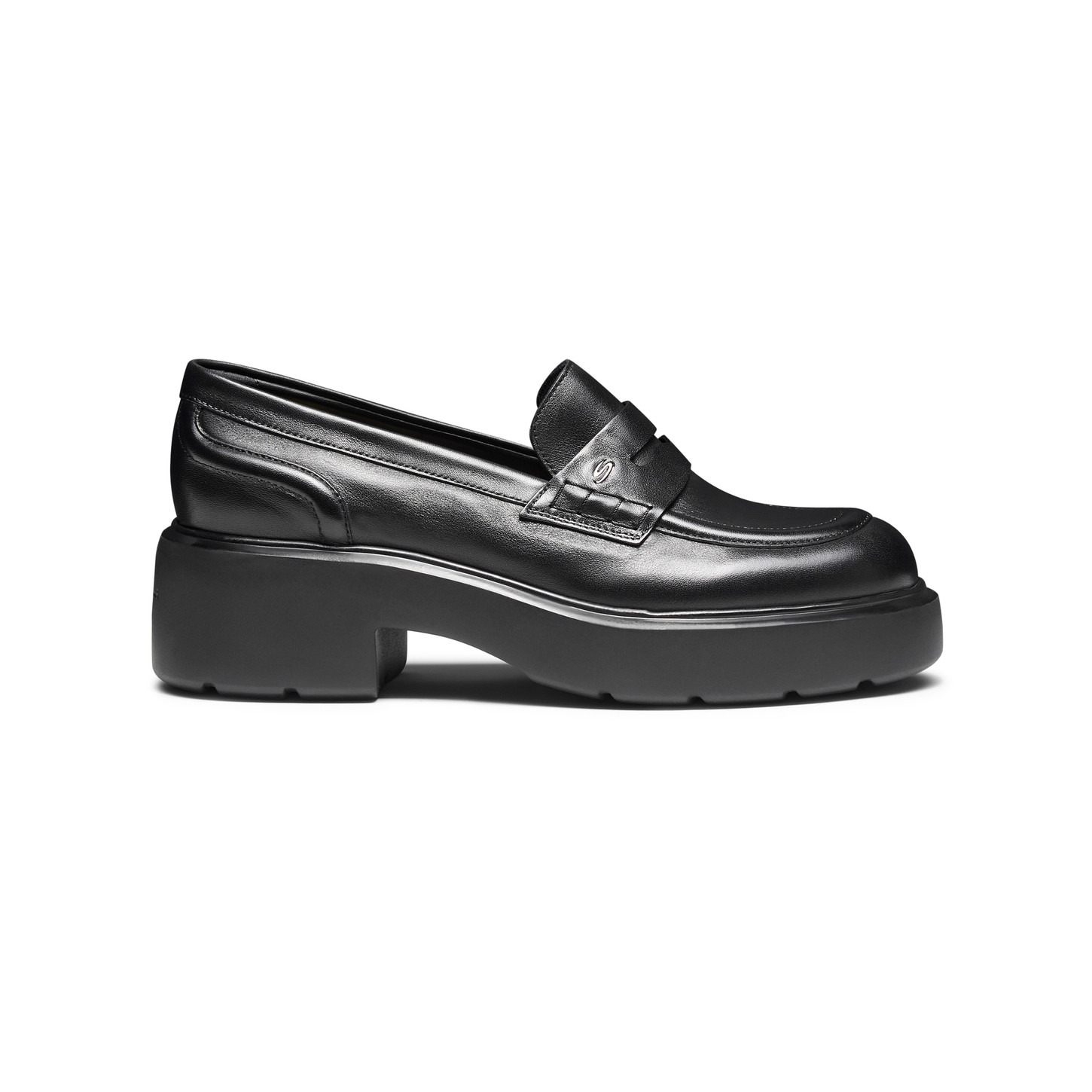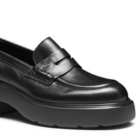 This women’s loafer from the Santoni Easy collection reinterprets a timeless classic with fresh artisanal vision and modern proportions. Its robust silhouette with round toe is crafted from leather, supported by a rubber platform sole with a surprisingly lightweight feel. Detailed with a quintessential penny slot and orange details on the tread that reveal the radiant allure of our hallmark Arancio Santoni with every stride. Product details Product ID: WUEW71868SMOTDYLN01 - Crafted from leather - Color: black - Classic saddle strap - Apron stitching - Domed silhouette with round toe - Chunky rubber platform sole - Arancio Santoni orange detail on the tread - 5 cm block heel - Metal S logo on the saddle strap - Printed Santoni logo on the insole - Made in Le Marche, Italy